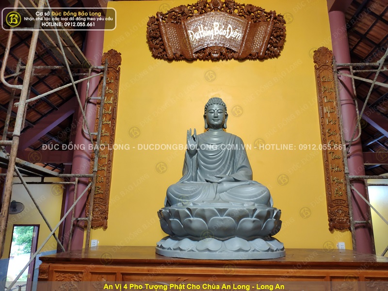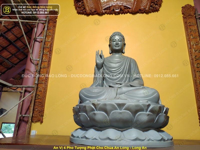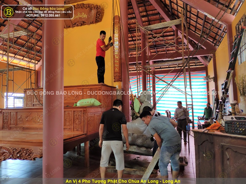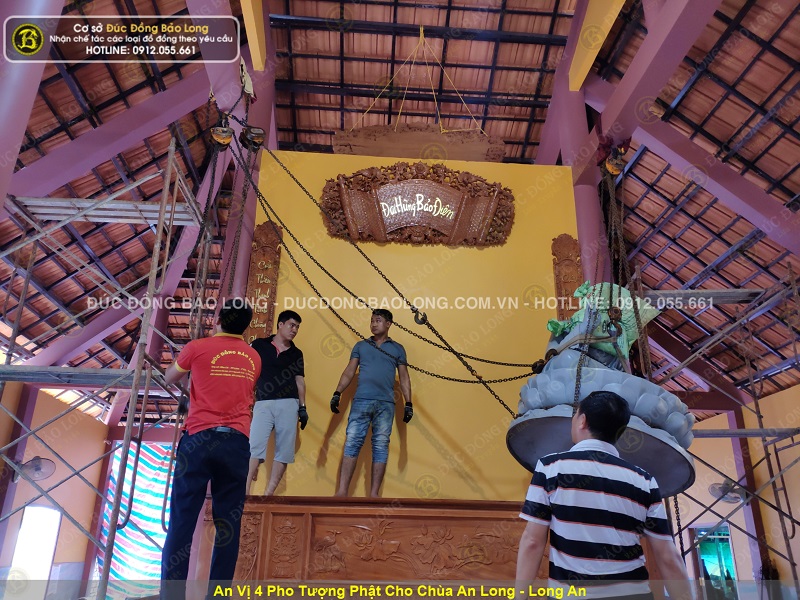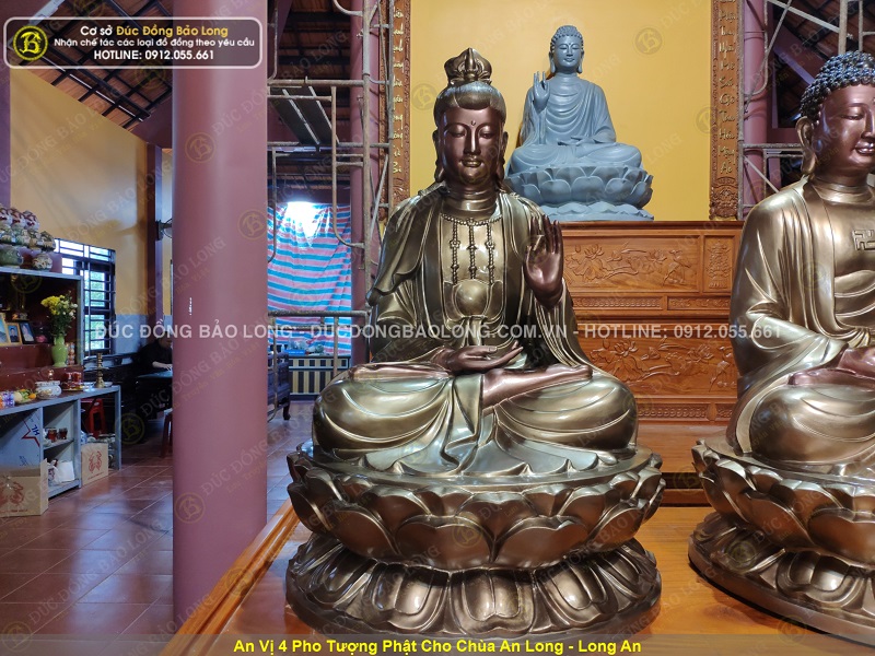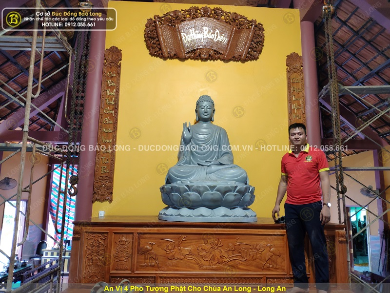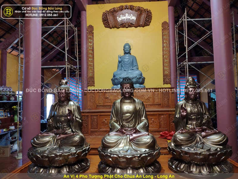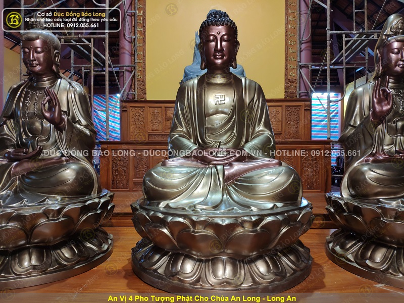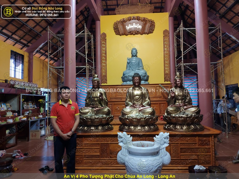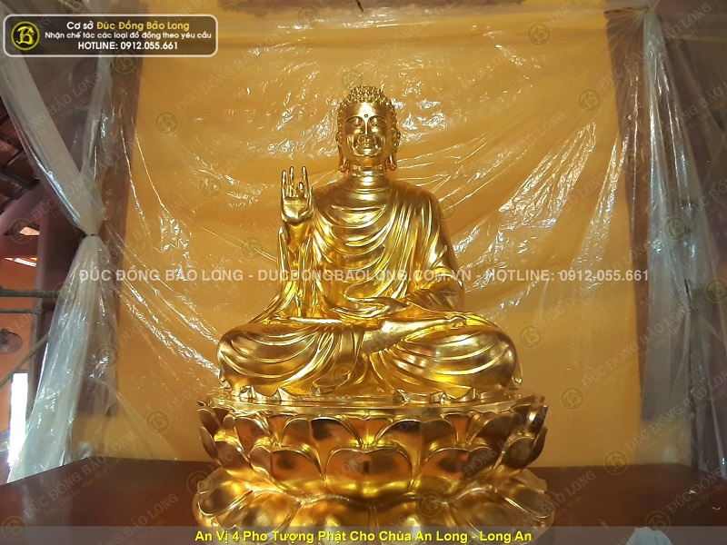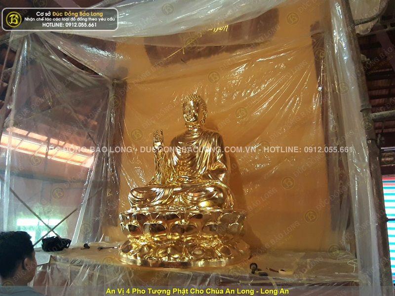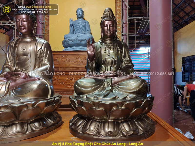 Chúng tôi đã cử đội ngũ vận chuyển và lắp đặt cho chùa. 4 pho tượng Phật được an vị và hoàn thiện thếp vàng ngay sau đó. Cơ sở Đúc Đồng Bảo Long xin gửi lời cảm ơn đến quý chùa, quý phật tử chùa An Long đã tin tưởng và giúp đỡ chúng tôi hoàn thiện pho tượng thành công tốt đẹp.