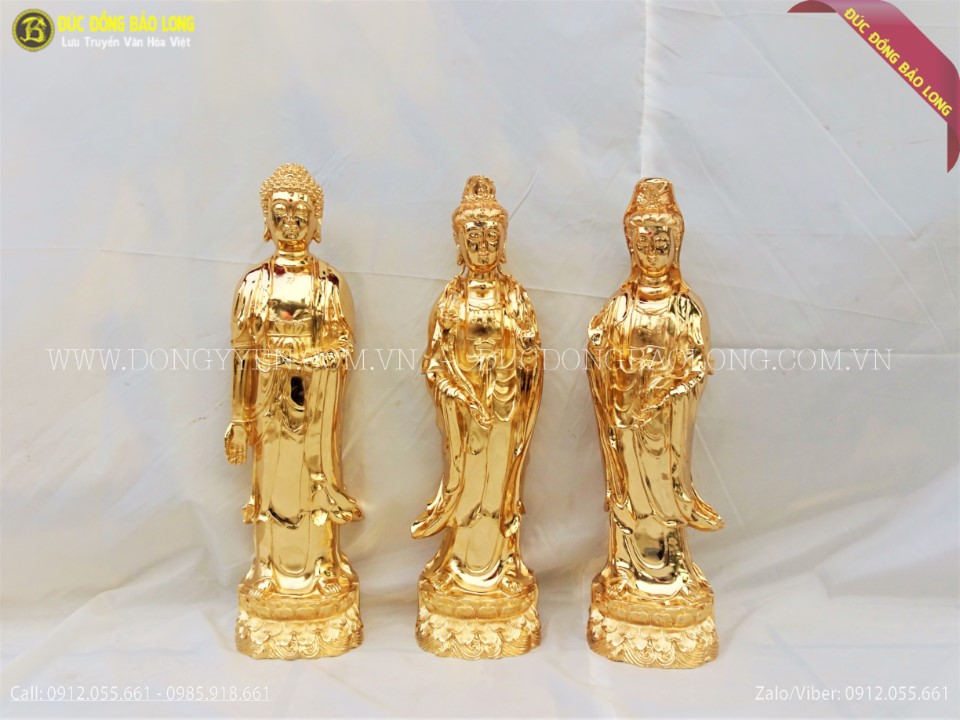 - Tượng Tam Thánh Tây Phương bằng đồng: có các kích thước phổ biến 60cm dành để thờ tại gia giá dao động từ 12tr/bộ, mạ vàng 24k chỉ từ 39tr/bộ.