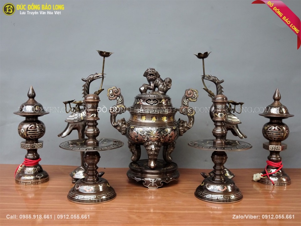 Bộ đồ thờ bằng đồng khảm ngũ sắc: có những kích thước 45cm ,50cm, 55cm, 60cm, 70cm.