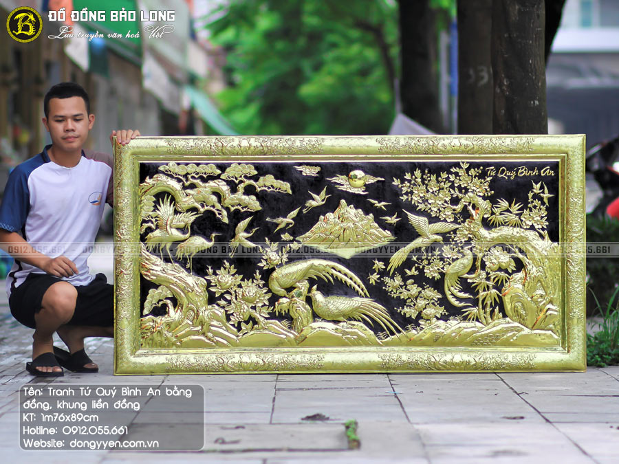 Hiện tại, Bảo Long chế tác rất nhiều những bức tranh từ cỡ nhỏ đến cỡ lớn, mọi kích thước đều chuẩn theo thước loban như 88cm, 90cm, 1m, 1m07, 1m1, 1m27, 1m55...Ngoài các kích thước đó, quý khách có thể yêu cầu đặt hàng những kích thước lớn hơn tùy ý. Tranh tứ quý bằng đồng có thể là 4 bức tranh rồi hoặc 1 bức liền dài, quý khách tham khảo các mẫu Tranh Tứ Qúy trên website để tham khảo thêm.