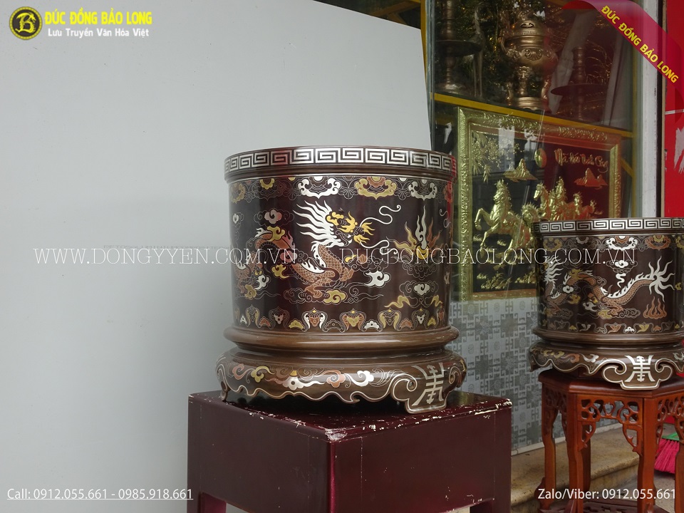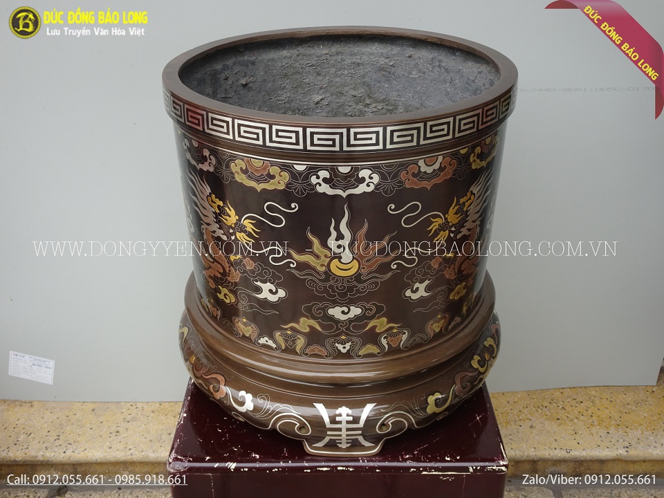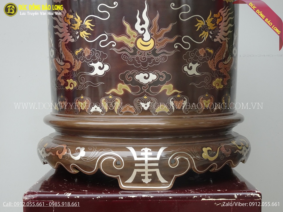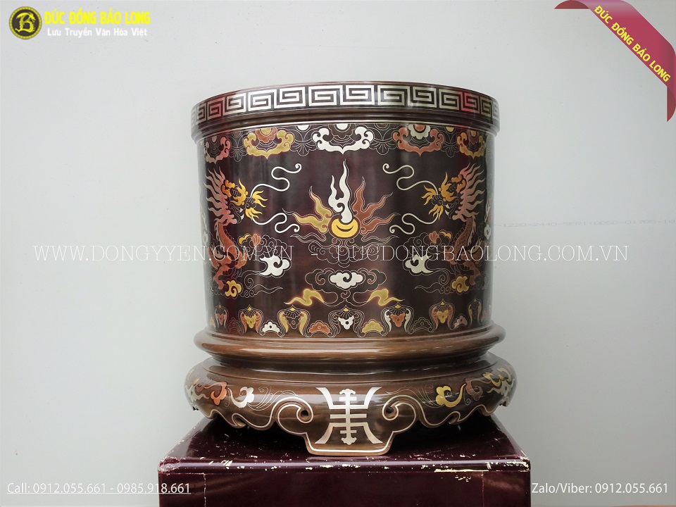 Bát hương đồng khảm ngũ sắc 42cm là loại bát hương đồng có kích thước lớn vừa được cơ sở Đúc Đồng Bảo Long hoàn thiện. Bát hương đồng 42cm thường được sử dụng cho các bàn thờ cỡ lớn như bàn thờ nhà chùa, đình, miếu, điện thờ, nhà thờ tổ. Thông thường bát hương đồng khảm ngũ sắc sẽ đi kèm với bộ đồ thờ ngũ sắc để đồng bộ, không nên sử dụng với bộ đồ thờ khác loại sẽ làm mất thẩm mỹ, không đồng nhất màu sắc trên ban thờ.