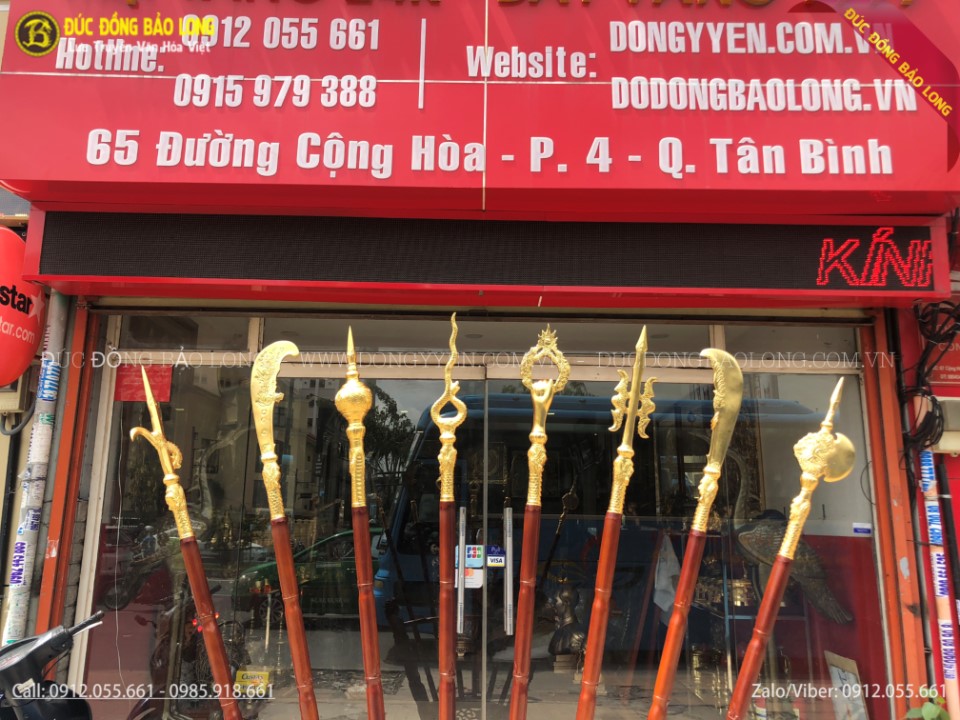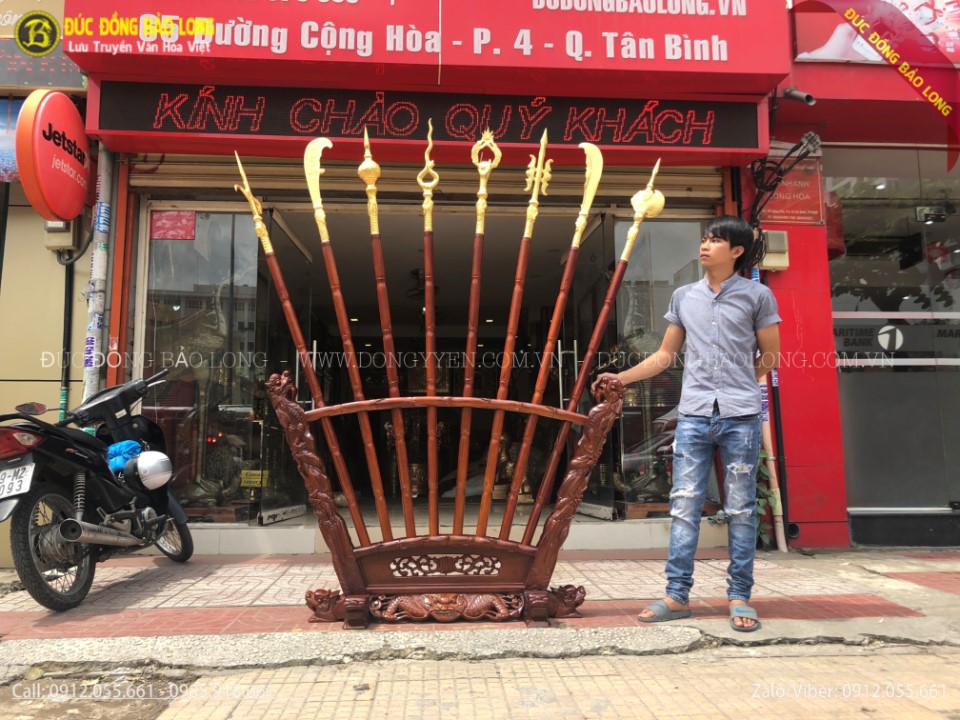 Cơ sở Đúc Đồng Bảo Long vừa hoàn thiện đơn hàng cho vị khách ở Tây Ninh với sản phẩm là bộ bát bửu bằng đồng 2m17 dát vàng 9999. Bộ bát bửu được chia làm 3 bộ phân tách biệt là phần lưỡi, phần cán và giá đỡ.