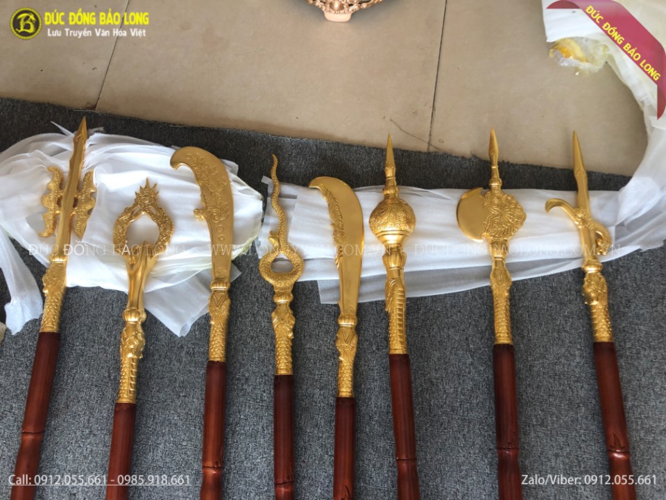 Phần lưỡi của bộ binh khí được thúc chạm bằng đồng, sau đó được dát vàng 9999 lên toàn bộ bề mặt tạo ra bề mặt sáng đẹp tự nhiên và luôn giữ mãi với thời gian. Phần cán và giá đỡ được làm bằng gỗ gụ cao cấp, chạm hoa văn tinh xảo cực đẹp. Gỗ được xử lý đảm bảo không bị co gót, gãy,...