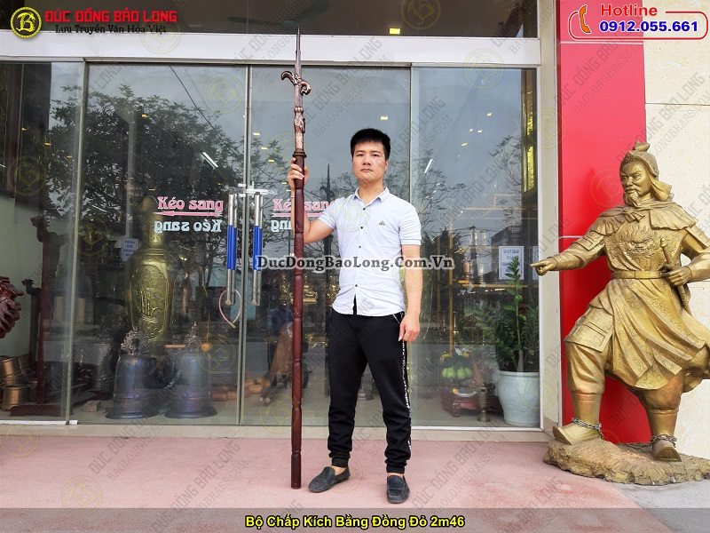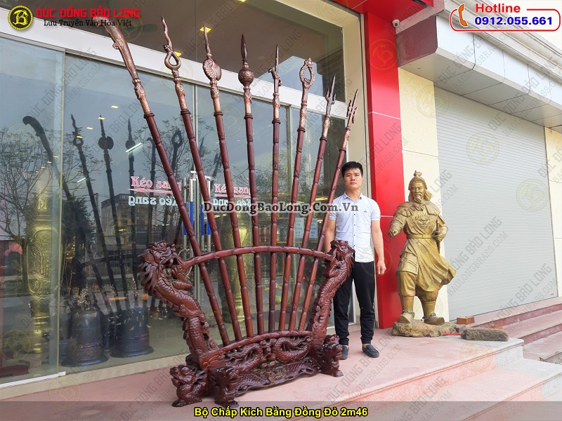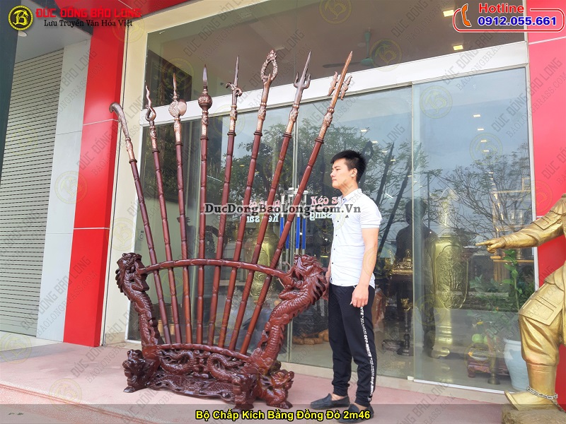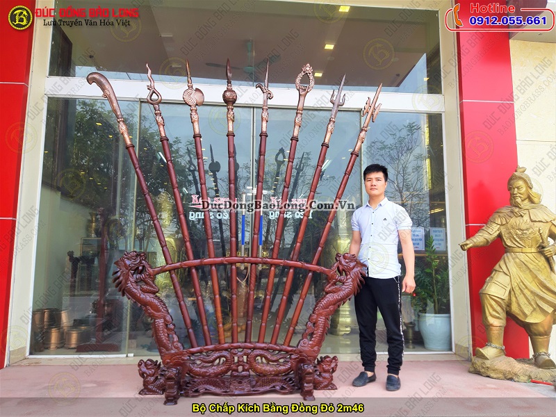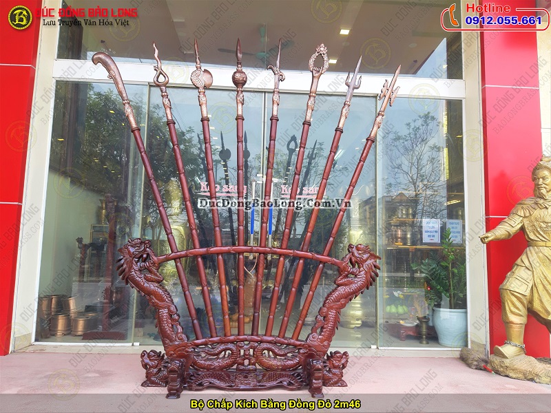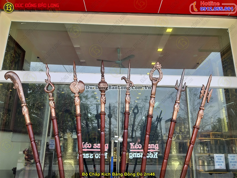 Cơ sở Đúc Đồng Bảo Long vừa hoàn thiện bộ chấp kích bằng đồng đỏ 2m46. Bộ bát bửu được chia làm 3 bộ phân tách biệt là phần lưỡi, phần cán và giá đỡ.