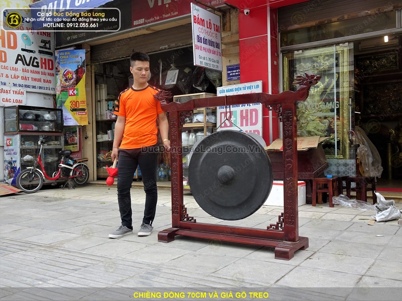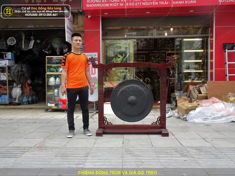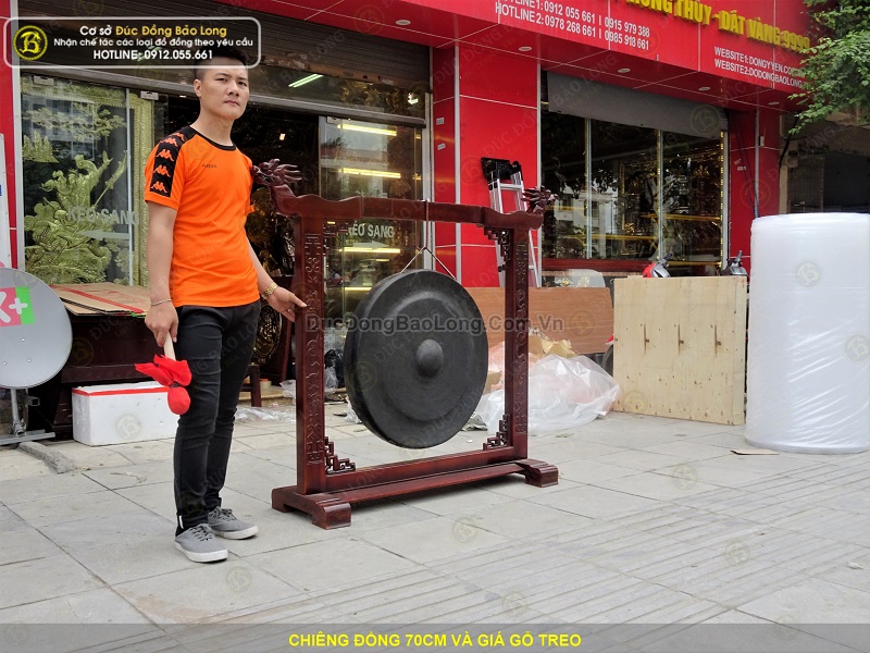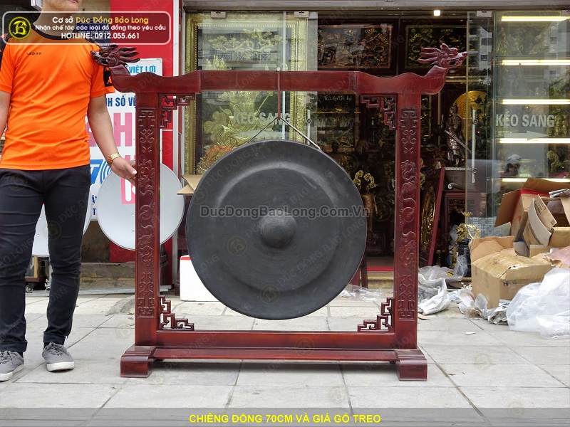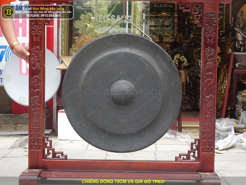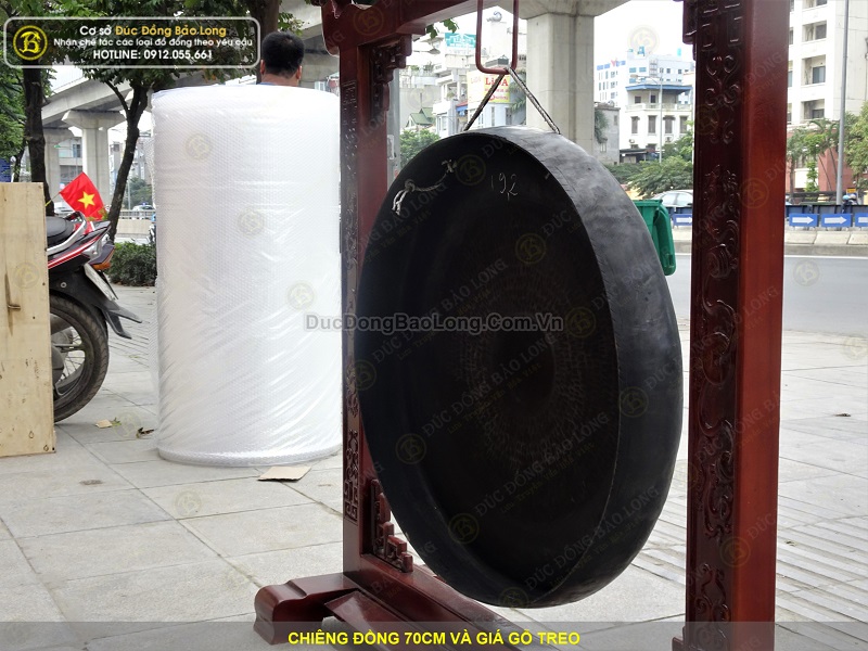 Cơ sở Đúc Đồng Bảo Long vừa hoàn thiện bộ chiêng đồng đường kính 70cm và giá gỗ treo. Chiêng đồng được chế tác bởi bàn tay nghệ nhân, chúng tôi đã dùng búa đập đều xung quanh để gò tạo thành hình dáng của chiếc chuông đồng. Do vậy trên bề mặt chiêng đông luôn đọng lại hình của những nhát búa đập. Trên bề mặt thường không chạm hoa văn. Ở giữa trung tâm tạo núm chiêng để có thể dùng gùi tác động lên bề mặt tạo ra âm thanh.