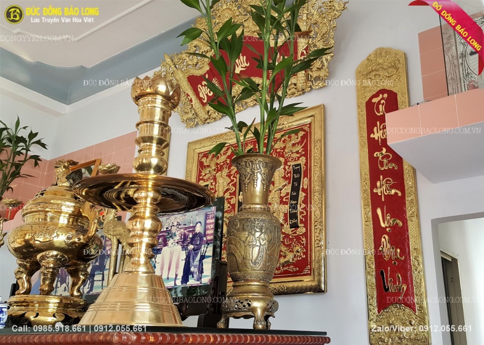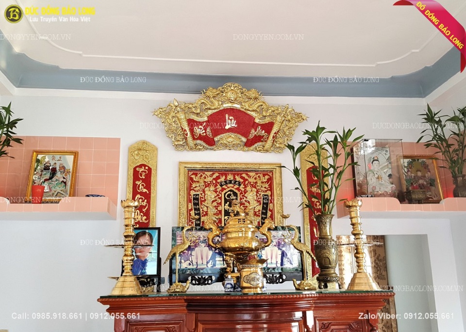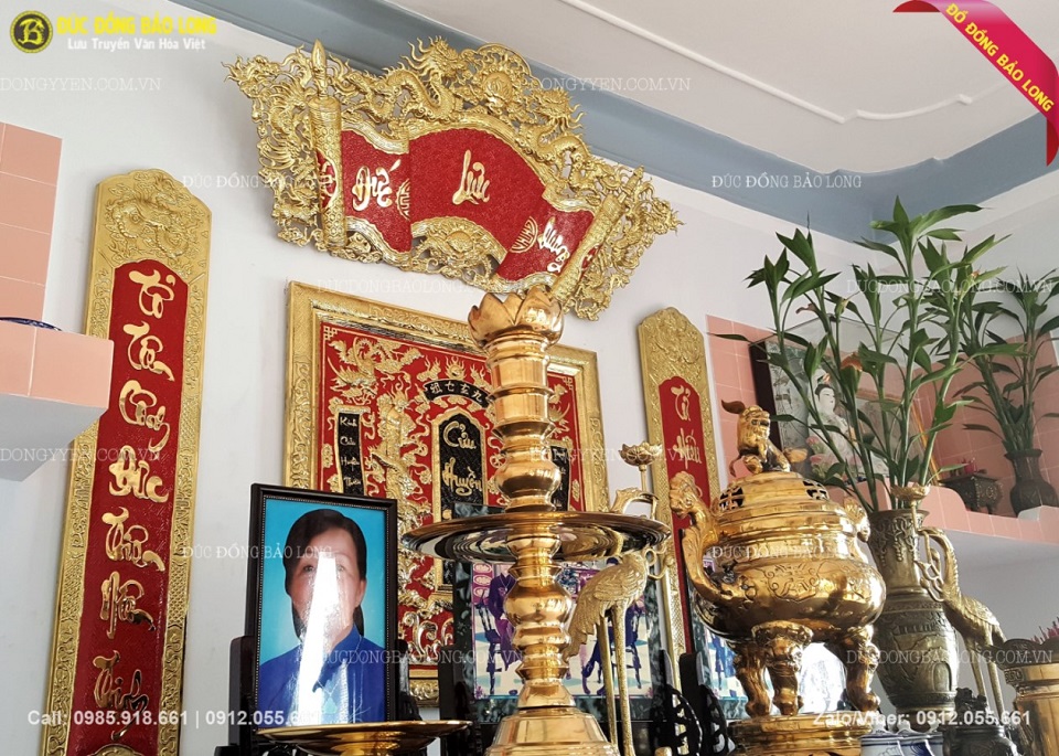 Cơ sở Đúc Đồng Bảo Long đã hoàn thiện việc chế tác và lắp đặt bộ cuốn thư câu đối và cửu huyền thất tổ bằng đồng cho khách TPHCM. Toàn bộ sản phẩm được chạm hoàn toàn thủ công từ đồng vàng nguyên tấm dày 8rem nhập khẩu ở Hàn Quốc, khung xương inox. Nền tranh được tô sơn màu đỏ. Đây là một trong những mẫu cuốn thu câu đối đẹp và nên sử dụng trong phòng thờ gia đình. Ngoài ra, chúng tôi còn rất nhiều mẫu cuốn thư, quý khách có thể tham khảo tại đây => Cuốn Thư Câu Đối Bằng Đồng