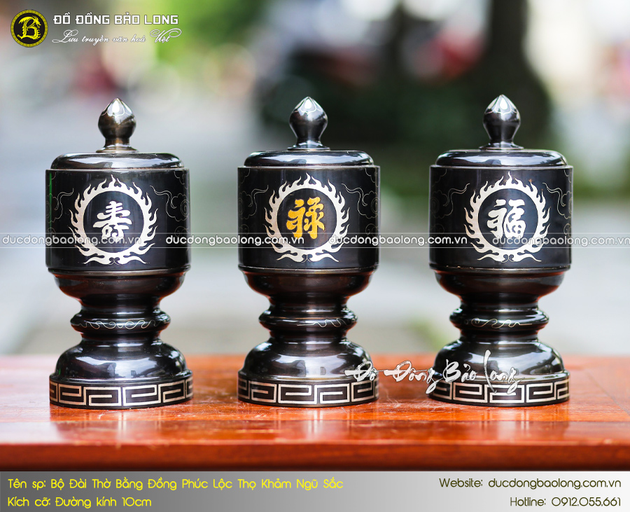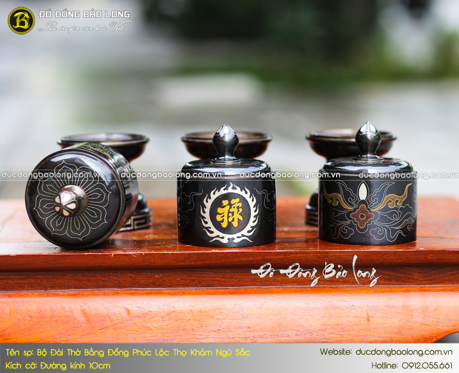 Đem đến vẻ đẹp sang trọng, đẳng cấp cho không gian thờ, bộ đài thờ bằng đồng khảm ngũ sắc chữ Phúc Lộc Thọ là dòng sản phẩm cao cấp tại cơ sở Đúc Đồng Bảo Long. Vẫn giữ nguyên kiểu dáng truyền thống nhưng được cải tiến bắt mắt về mẫu mã, thiết kế, bộ đài thờ thể hiện trọn vẹn kỹ nghệ điêu khắc hoa văn, nghệ thuật đúc đồng đặc sắc của nghệ nhân cơ sở Bảo Long.
