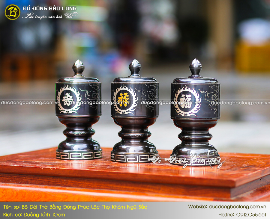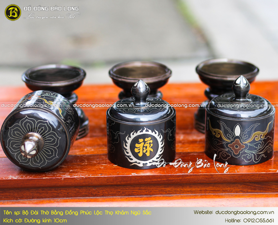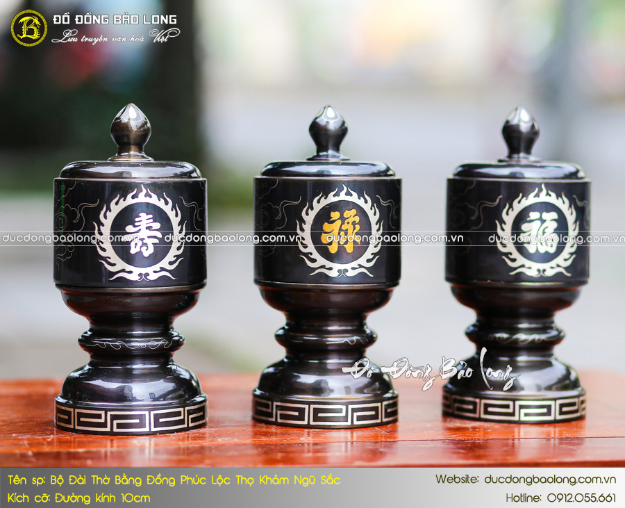 Bộ 3 mẫu đài thờ khảm ngũ sắc có kích thước và hình dáng giống nhau, chỉ khác ở chữ chạm lên sản phẩm. Với cấu tạo mỗi đài được chia làm 2 phần là phần nắp và chân trụ. Phần nắp có dạng trụ tròn với trên đỉnh nắp tạo hình quả nhót để cầm nắm thuận tiện hơn.