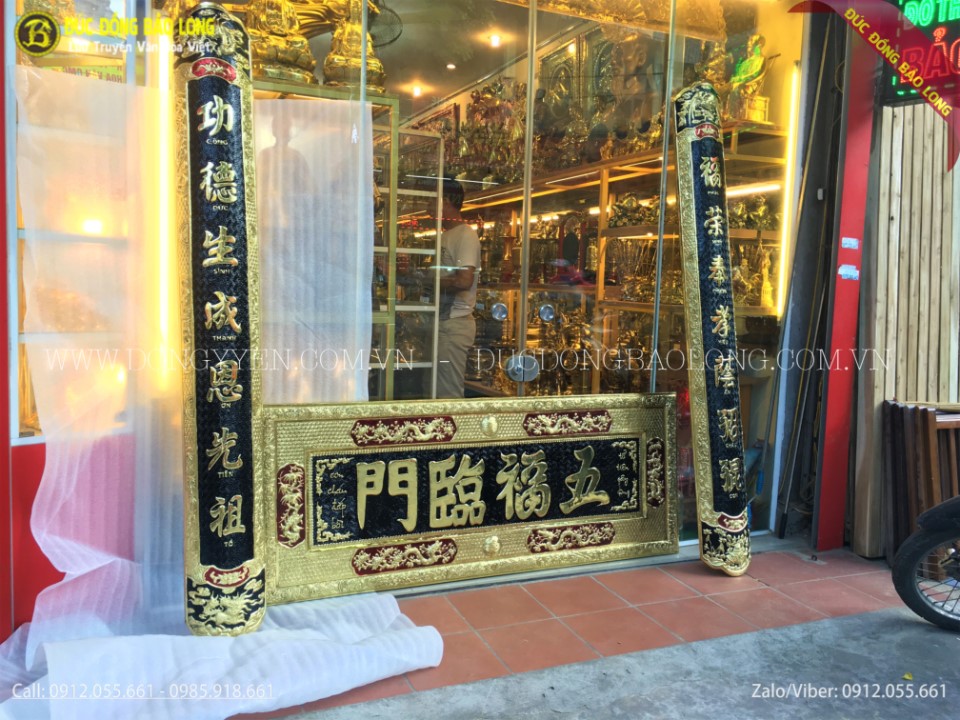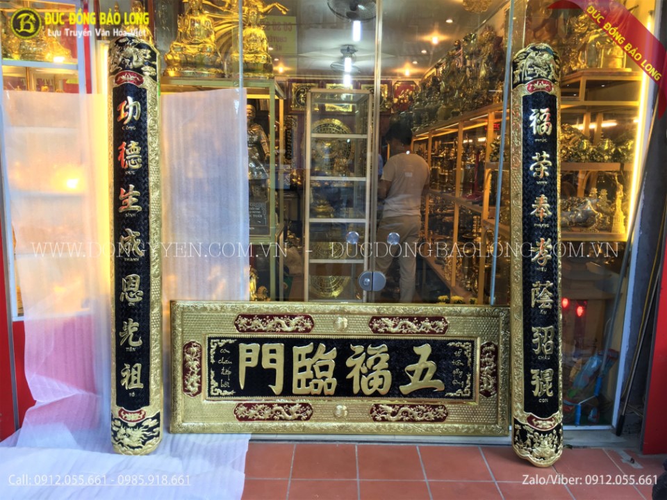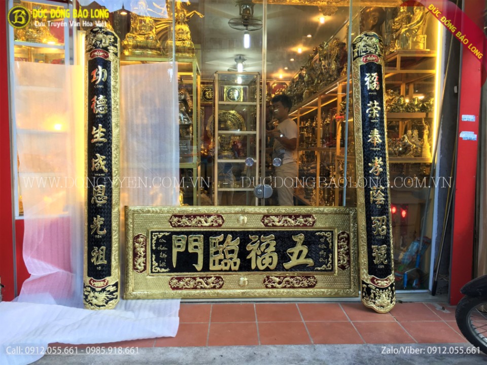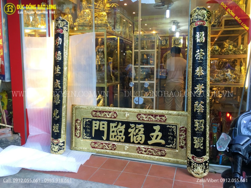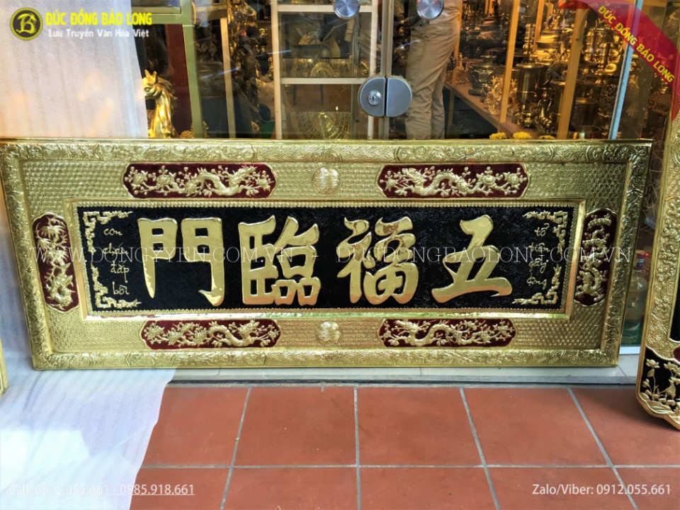 Bộ đại tự bằng đồng ngũ phúc lâm môn 1m97 được các nghệ nhân của Bảo Long chạm bằng tay từ nguyên liệu đồng vàng nhập khẩu Hàn Quốc, đồng dày 8rem, chạm rất tinh xảo, đường nét được chau chuốt, tỉ mỉ đến từng chi tiết nhỏ, phía sau có xương inox bảo vệ vừa giữ cho bức đại tự cũng như câu đối cứng cáp vừa là bộ phân trung gian giúp gắn vào tường một cách chắc chắc với độ bền cực cao, chữ được thúc nổi và nền được tô màu đen.