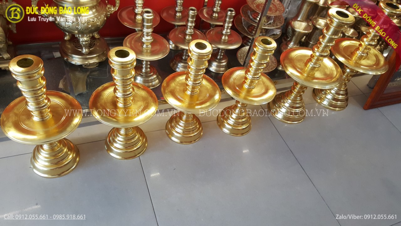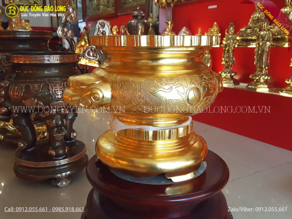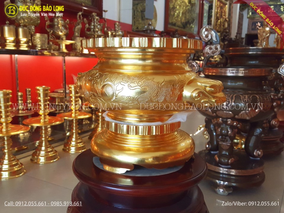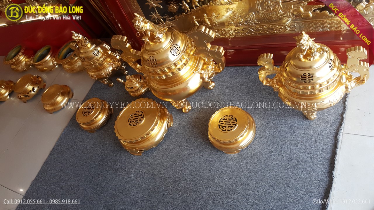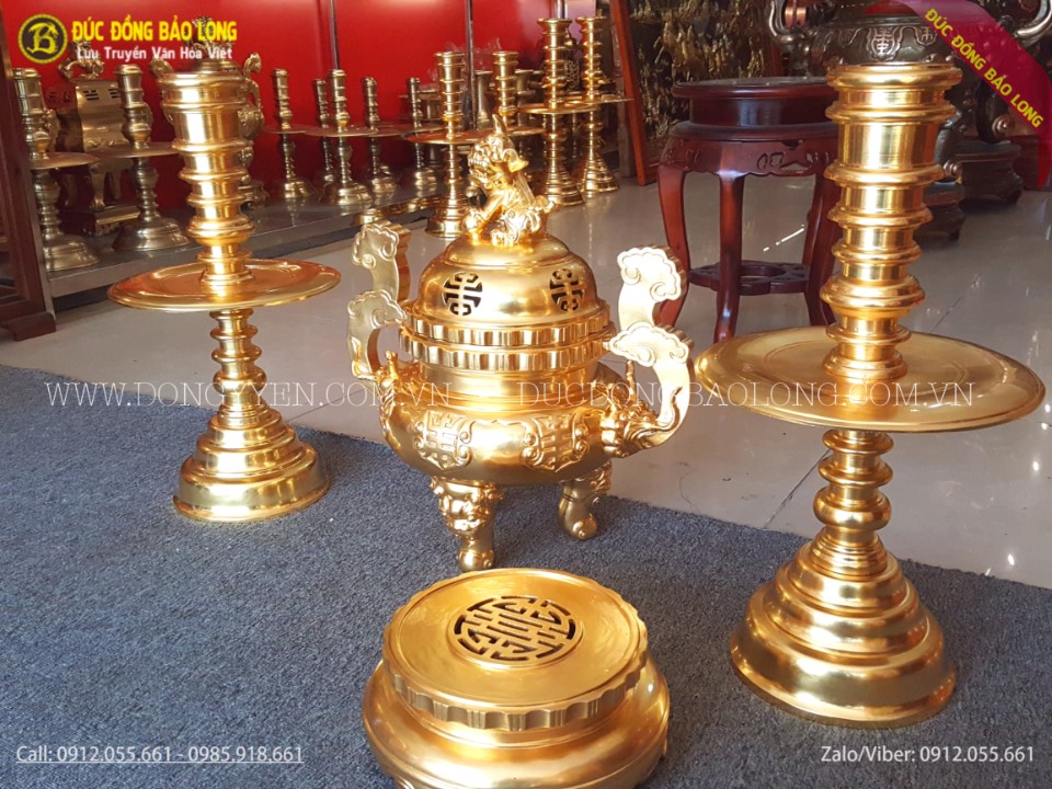 Bộ đồ thờ được đúc hoàn toàn thủ công bằng tay từ nguyên liệu đồng đỏ. Sau đó được người thợ làm nhẵn bề mặt và được tiến hành dát vàng lên bề mặt sản phẩm. Bộ đồ thờ được đúc theo mẫu cổ, rất hiếm và hiện chỉ có duy nhất cơ sở Đúc Đồng Bảo Long đang sở hữu mẫu sản phẩm này. Vàng được dát lên sản phẩm là loại vàng 9999 cao cấp nhất. Việc dát vàng sẽ làm cho sản phẩm sang trọng và còn giúp sản phẩm sáng mãu, luôn giữ màu vàng theo thời gian.