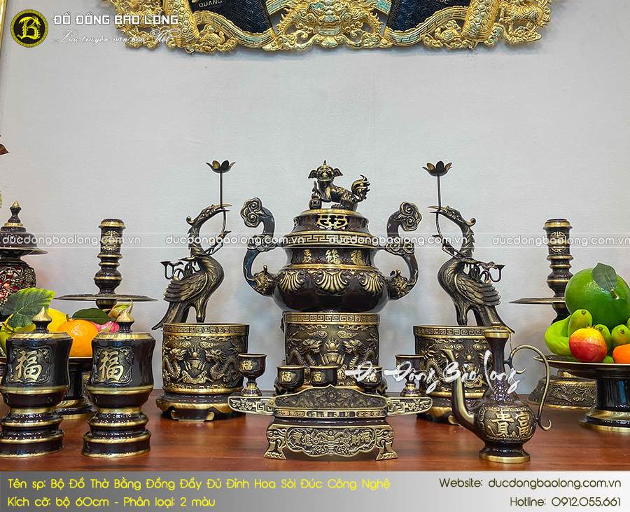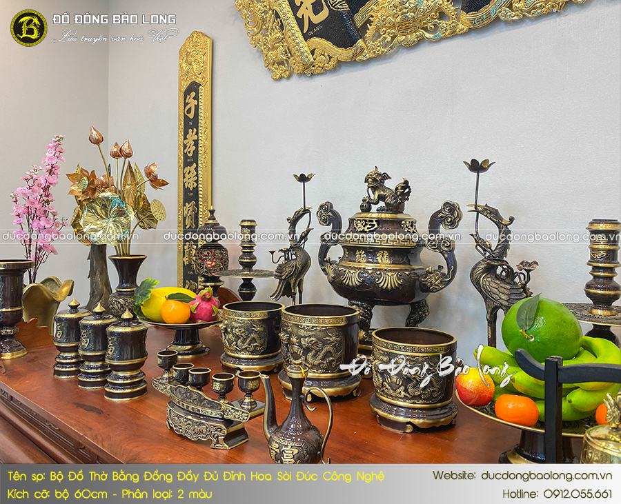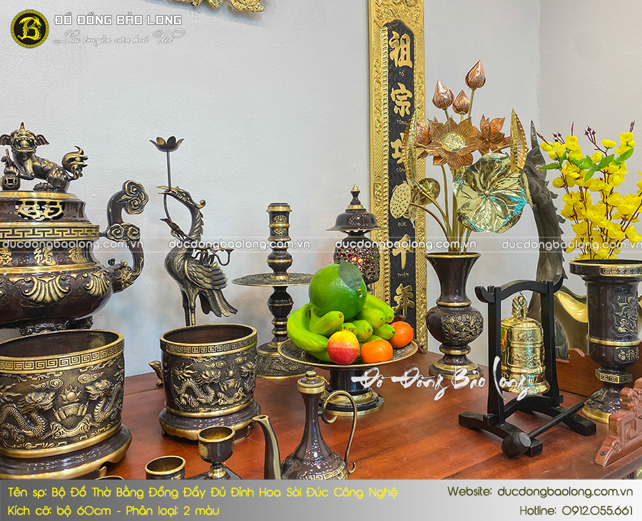 Bộ đồ thờ bằng đồng đầy đủ đỉnh hoa sòi đúc công nghệ bộ 60cm được nhiều khách hàng yêu thích và lựa chọn bởi chất lượng tốt, giá thành phải chăng, độ bên cao, mẫu mã đẹp. Bộ đồ thờ thích hợp cho ban thờ kích thước 1m76 - 1m97.