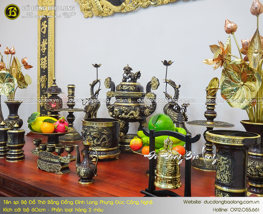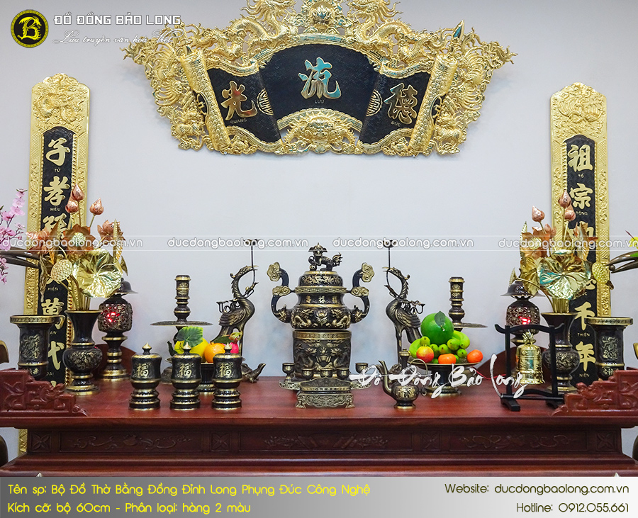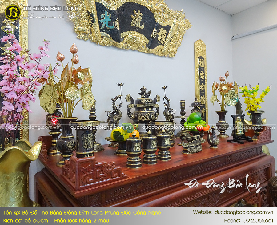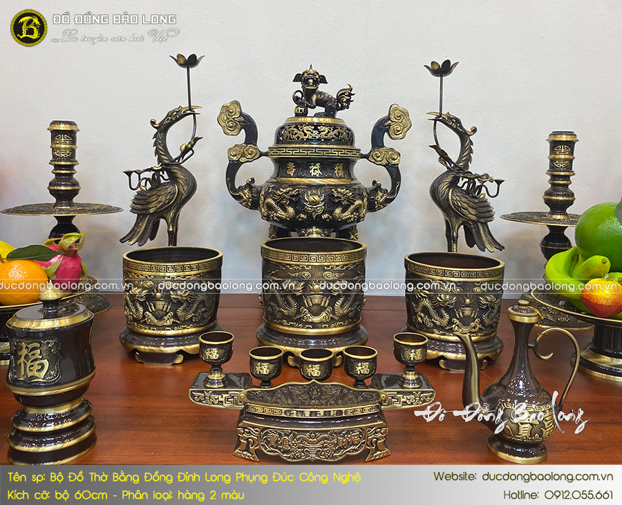 Bộ đồ thờ bằng đồng đầy đủ đỉnh hoa Long Phụng 2 màu bộ 60cm