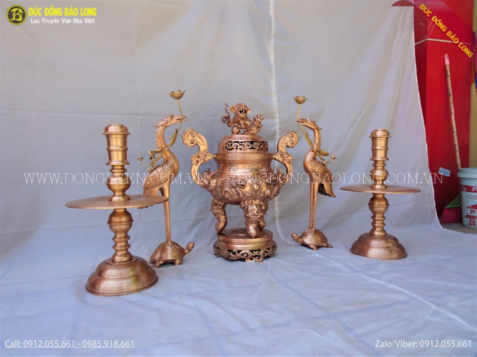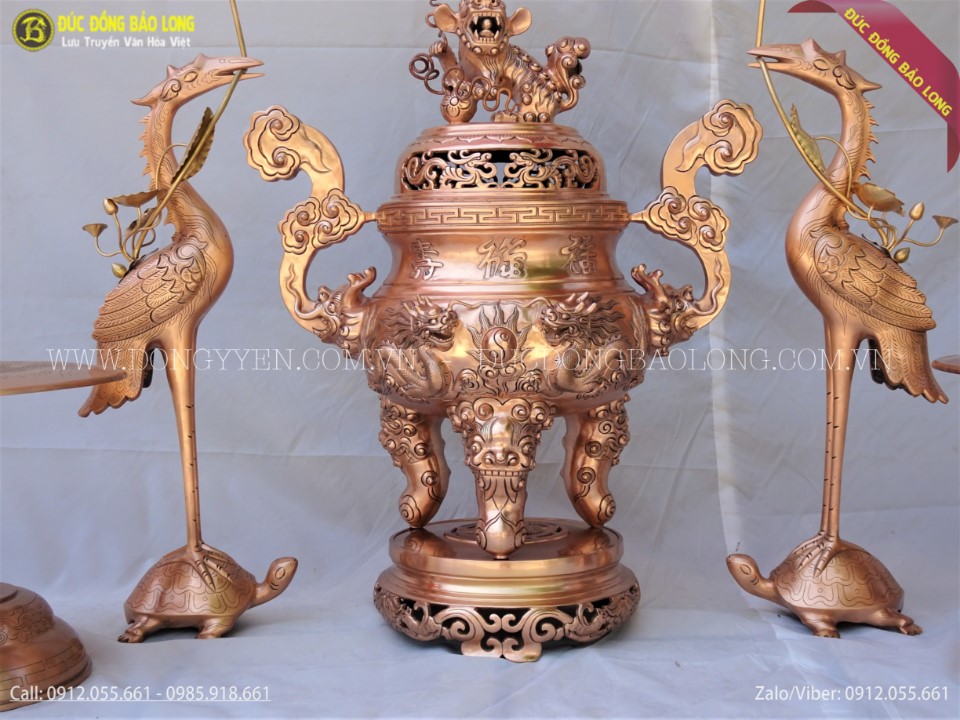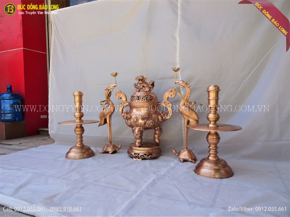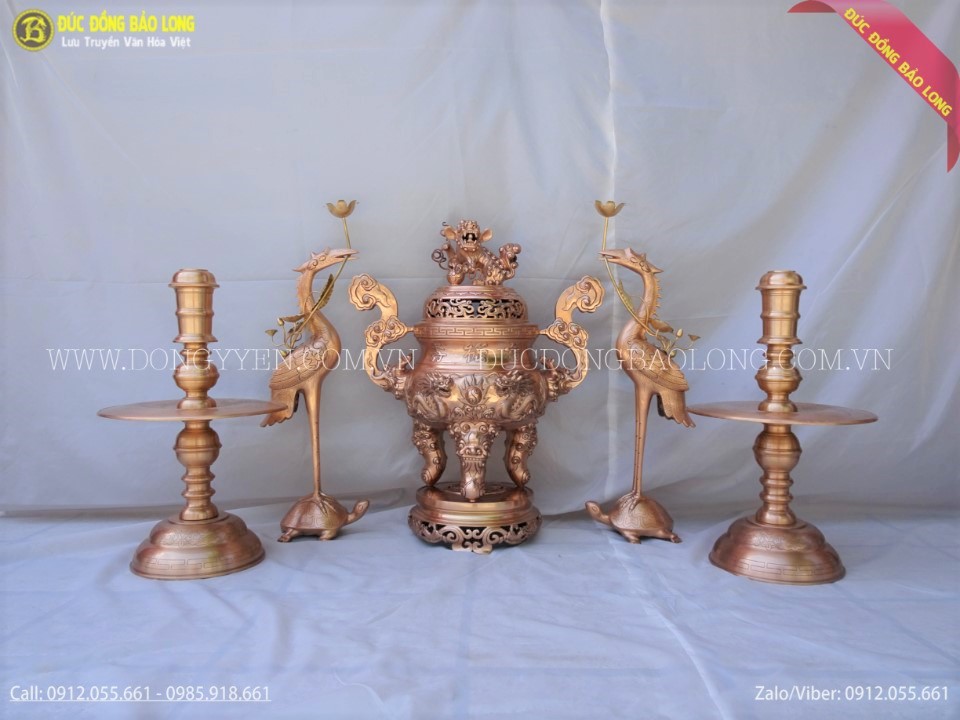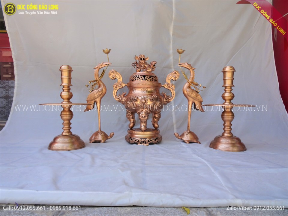 Bộ đồ thờ đúc rồng nổi được đúc hoàn toàn thủ công từ nguyên liệu đồng đỏ thanh khiết, đúc rất dày dặn, sản phẩm được giữ nguyên màu đồng đỏ, màu sáng nhờ phớt qua nước đồng sulfat. Hoa văn được chạm rất tỉ mỉ, sắc nét. Thân đỉnh được đúc nổi rồng chầu mặt nguyệt, mặt sau đúc hình đôi phượng. Mặt trước đỉnh đúc nổi 3 chữ Phúc Lộc Thọ. Hạc cũng được chạm ám các đường tơ tóc, mắt miệng gọn gẽ mềm mại, chạm mai rùa chi tiết, hạc ngậm sen chùm tách rời được gò thủ công bằng đồng đỏ, vừa dễ tháo lắp khi vận chuyển, lau chùi vừa làm cho đôi hạc đẹp hơn các mẫu hạc đúc liền rất nhiều.