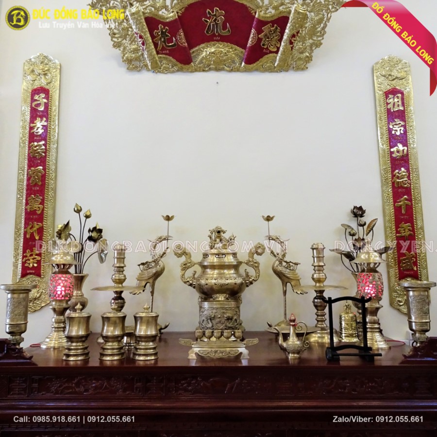 Bộ đồ thờ bằng đồng được chế tác hoàn toàn từ đồng nguyên chất, dưới bàn tay khéo léo của những nghệ nhân lâu năm của làng nghề đúc đồng truyền thống Vạn Điểm (Ý Yên - Nam Định). Mỗi vùng, mỗi địa phương đều có cách bày trí, sắp xếp bàn thờ gia tiên khác nhau và tùy theo kích thước bàn thờ mà lựa chọn các sản phẩm đồ thờ sao cho phù hợp. Tựu chung, bộ đồ thờ bằng đồng đầy đủ bao gồm những vật phẩm sau: