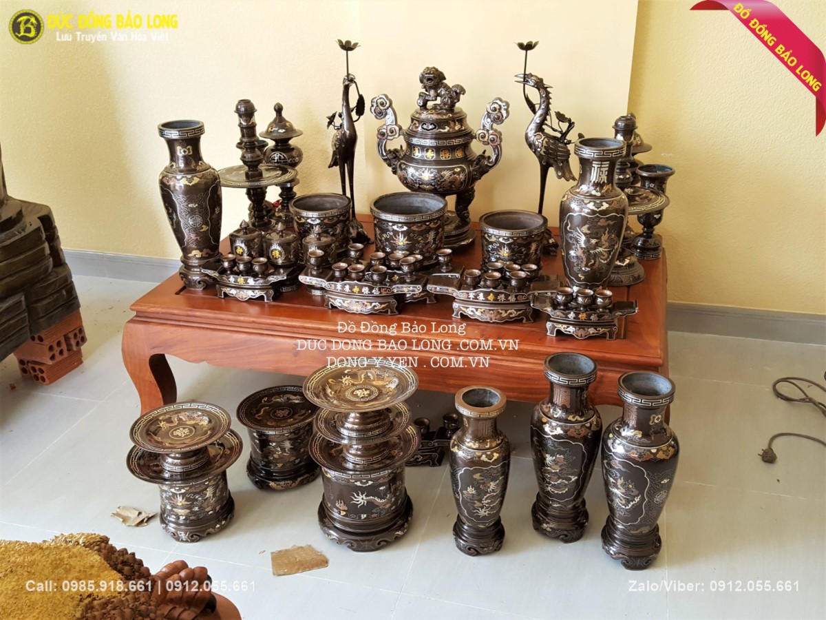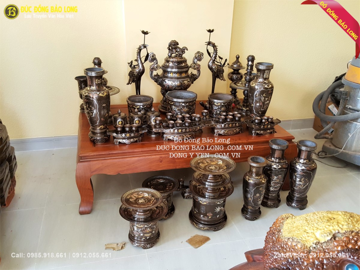 Cơ sở Đúc Đồng Bảo Long vừa đúc và giao hàng thành công bộ đồ thờ khảm ngũ sắc 60cm đầy đủ cùng một số sản phẩm phụ kiện mua thêm cho khách hàng tại Sài Gòn. Toàn bộ sản phẩm đều là hàng đặt được chính các nghệ nhân, thợ giỏi của làng nghề trực tiếp chế tác. Đỉnh đồng 60cm được khảm sắc nét, khảm 5 chữ vàng cao cấp cực đẹp. Bộ đồ thờ này dùng cho bàn thờ cỡ lớn từ 1m97 trở lên.