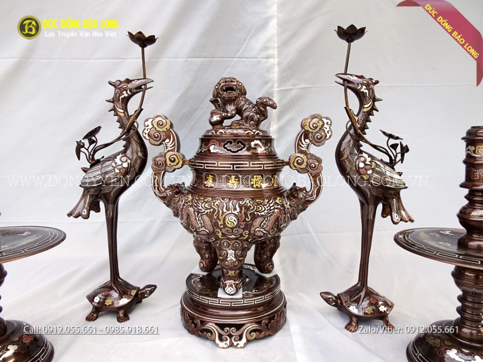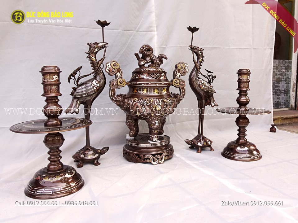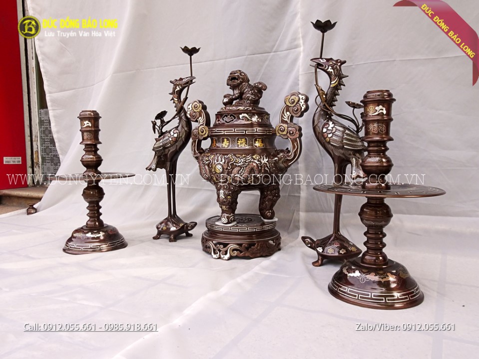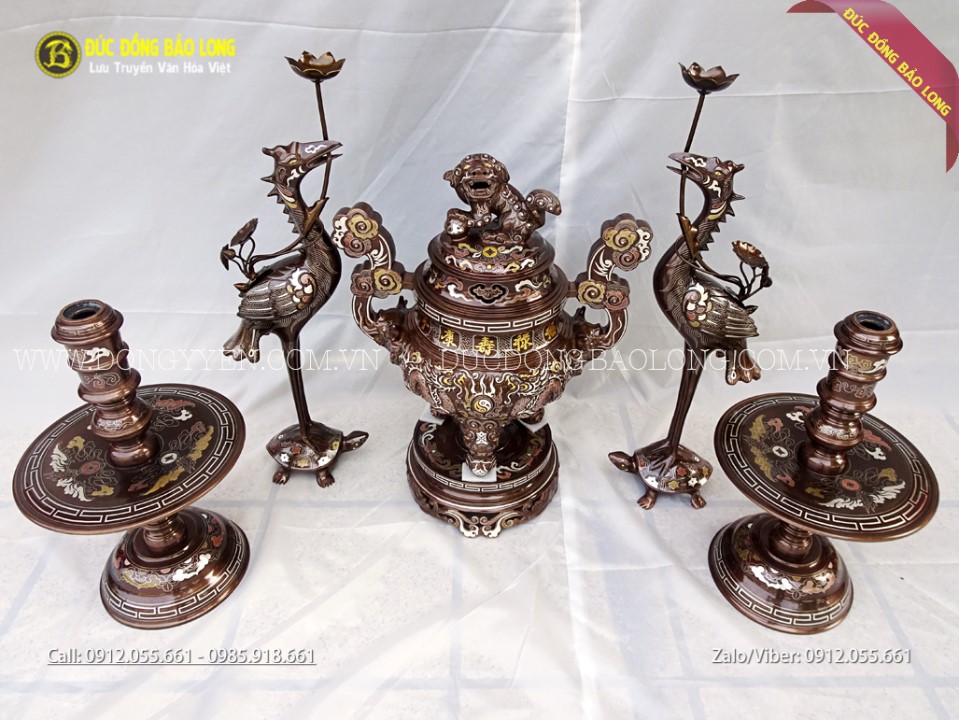 Tất cả các sản phẩm trong bộ đồ thờ được đúc hoàn toàn thủ công từ nguyên liệu đồng đỏ thanh khiết. Hình dáng mẫu mã được giữ nguyên mẫu truyền thống. Mọi quy trình đúc được kiểm duyệt từ khâu đắp mẫu đến khi hoàn thiện. Sản phẩn được mài dũa rất cẩn thận, kỹ lưỡng. Sau đó, các nghệ nhân tiến hành khảm ngũ sắc lên bề mặt sản phẩm vô cùng đẹp mắt với 5 lọa kim loại quý như vàng 9999, bạc 925, đồng đỏ, đồng xanh và đông đen. Cổ đỉnh khảm 5 chữ bằng vàng ta 9999 tuyệt đẹp. Đây là bộ đồ thờ cao cấp nhất hiện nay.
