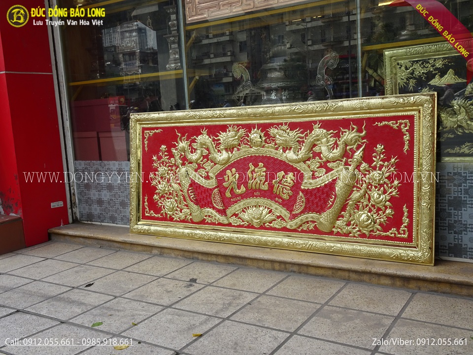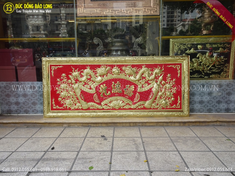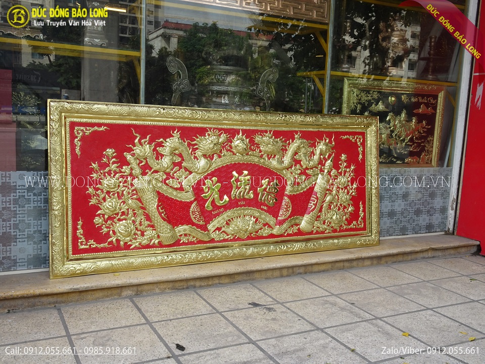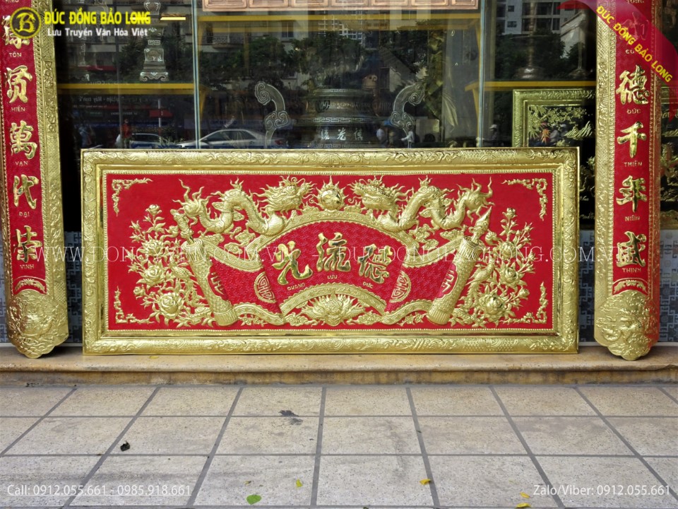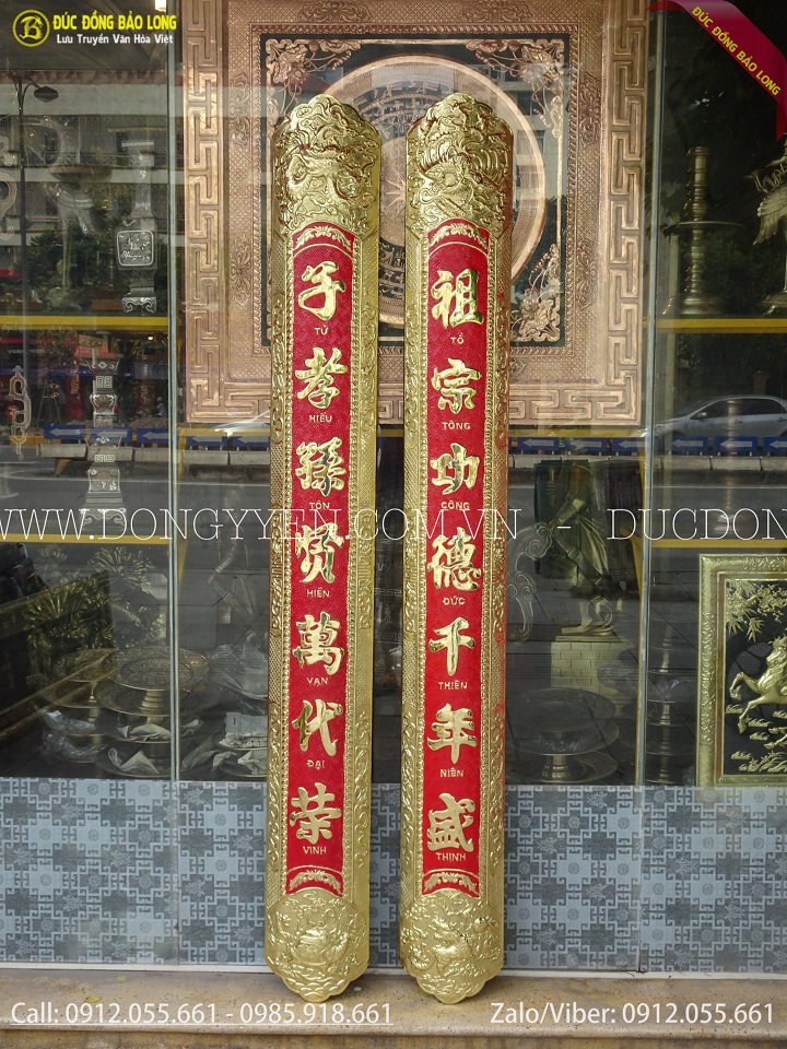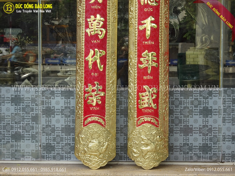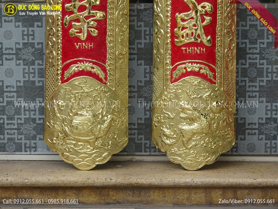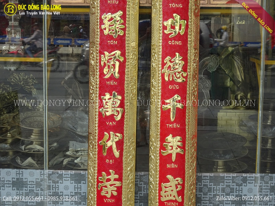 Bộ cuốn thư câu đối bằng đồng cho nhà thờ họ vừa được cơ sở Bảo Long hoàn thiện việc chế tác và lắp đặt thành công cho vị khách ở Nghệ An. Sản phẩm được các nghệ nhân của Bảo Long chạm bằng tay từ nguyên liệu đồng vàng nhập khẩu Hàn Quốc, đồng dày 8rem, khung xương inox 304 cho độ bền mãi mãi với thời gian. Hàng chạm tinh xảo, sắc nét, chữ được thúc nổi và nền được tô màu đỏ.