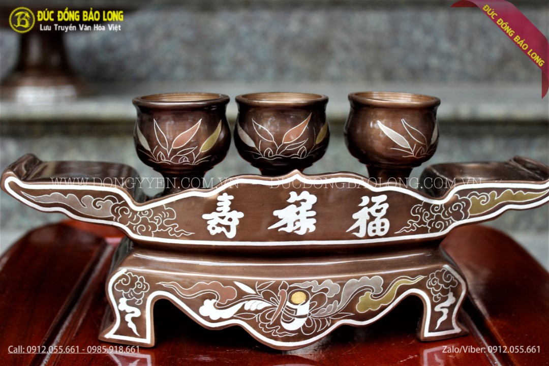 Bộ sản phẩm gồm 1 khay và 3 chén được đúc hoàn toàn thủ công từ nguyên liệu bằng đồng nồi hè, đúc tinh xảo, dày dặn. Chén và khay được đúc dạng trơn và đánh bóng, sau đó được các nghệ nhân chạm các đường nét hoa văn trên sản phẩm rất đẹp, sử dụng các kim loại quý để đưa vào bề mặt như vàng 9999, bạc và đồng đỏ gọi là khảm tam khí. Bộ sản phẩm thường dùng để mời trà, rượu, nước khi cúng sử dụng cho bàn thờ cỡ nhỏ và vừa.