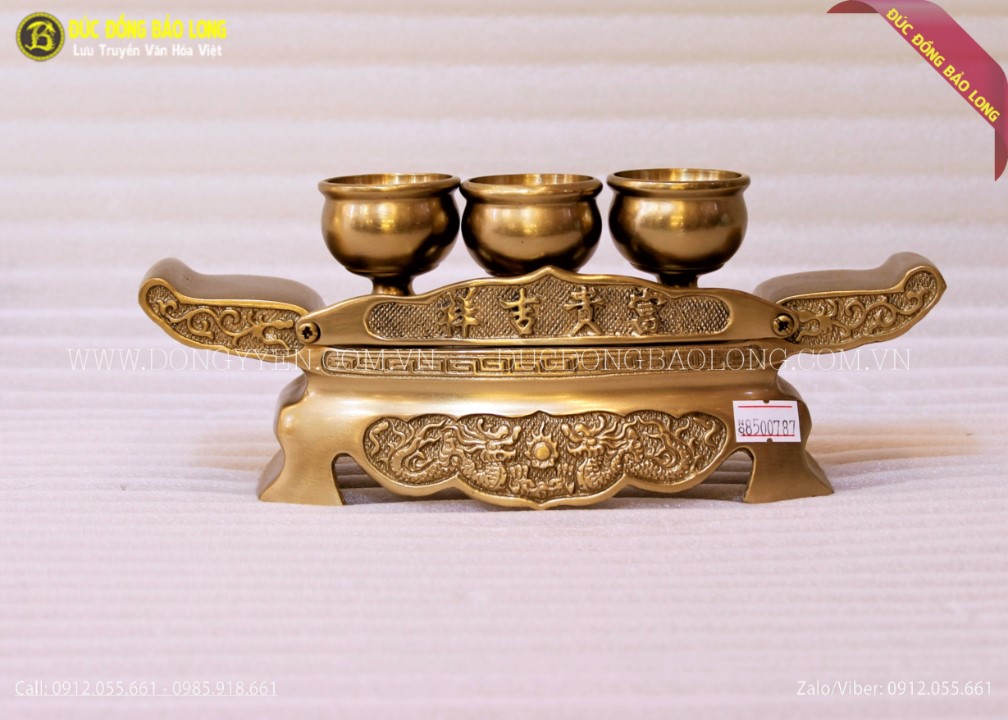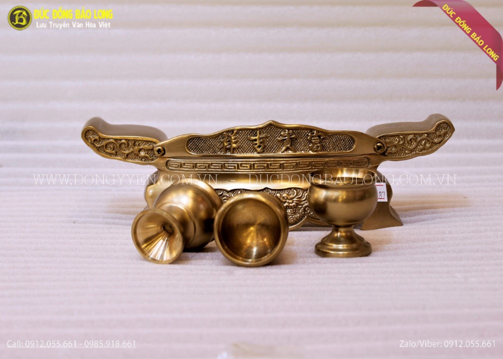Bộ sản phẩm gồm 1 khay và 3 chén được đúc hoàn toàn thủ công từ nguyên liệu bằng đồng thau, đúc tinh xảo. Chén được đúc dạng trơn và đánh bóng. Bộ sản phẩm được giữ nguyên màu mộc thường dùng để mời trà, rượu, nước khi cúng sử dụng cho bàn thờ cỡ vừa và nhỏ.