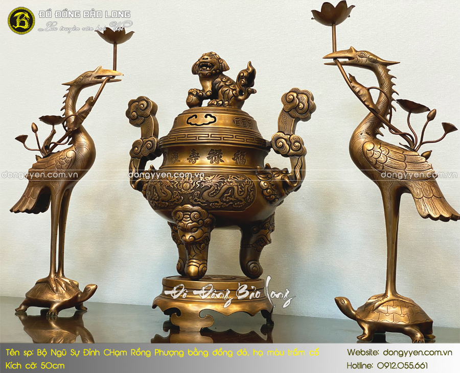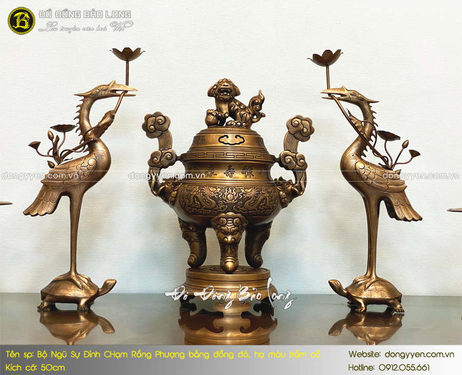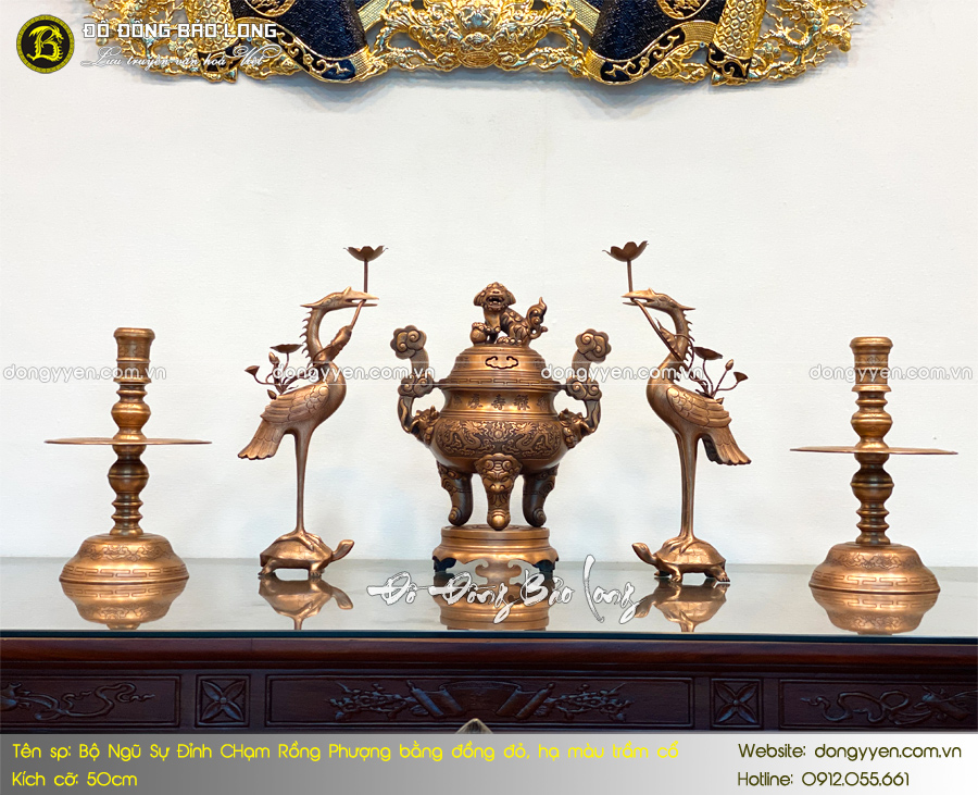 Bộ Ngũ sự đỉnh chạm Long Phụng bằng đồng đỏ giả cổ 50cm