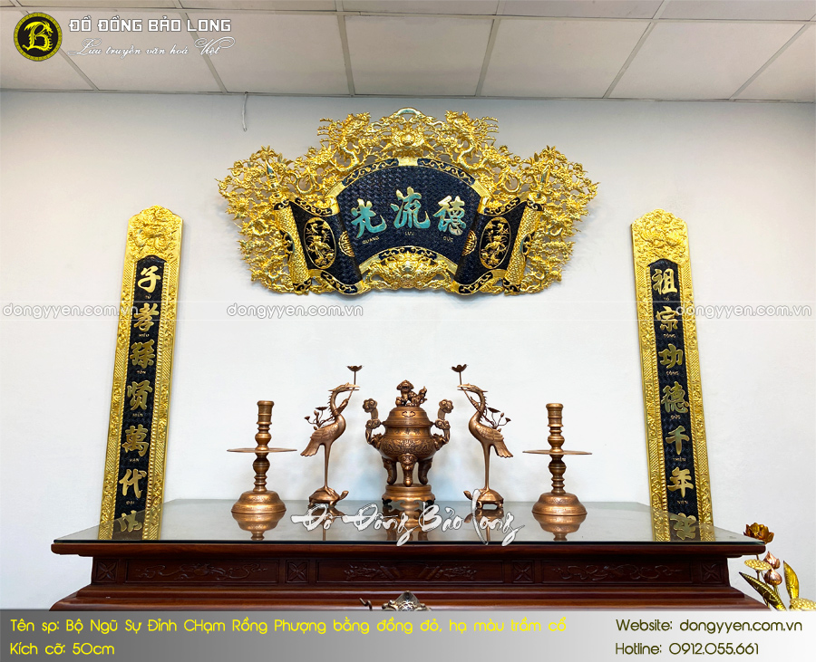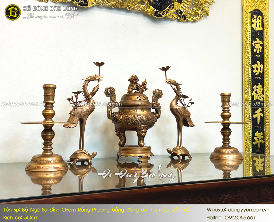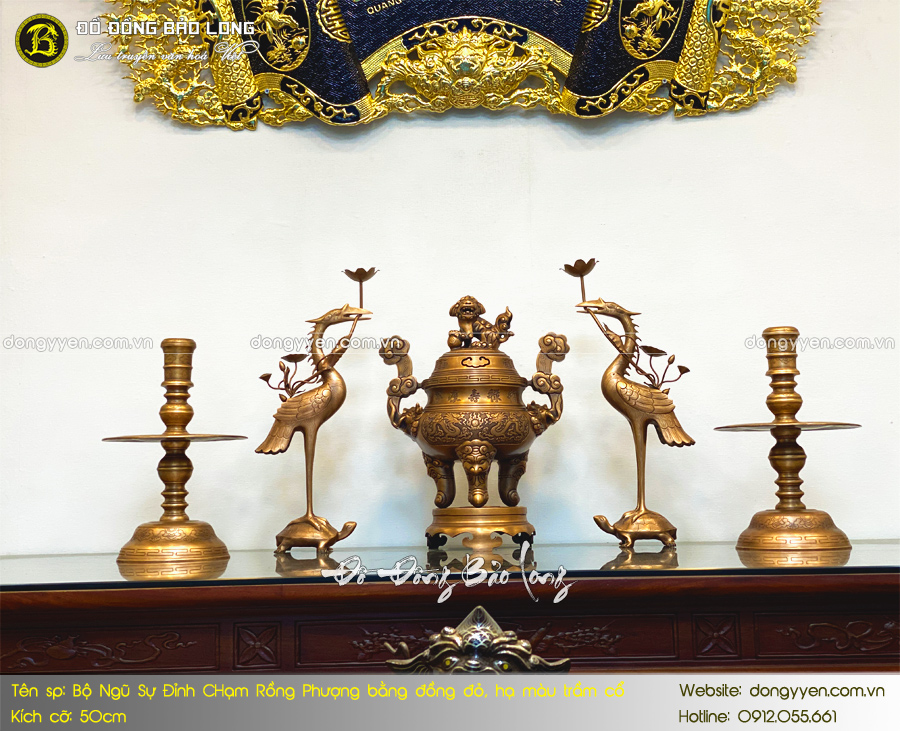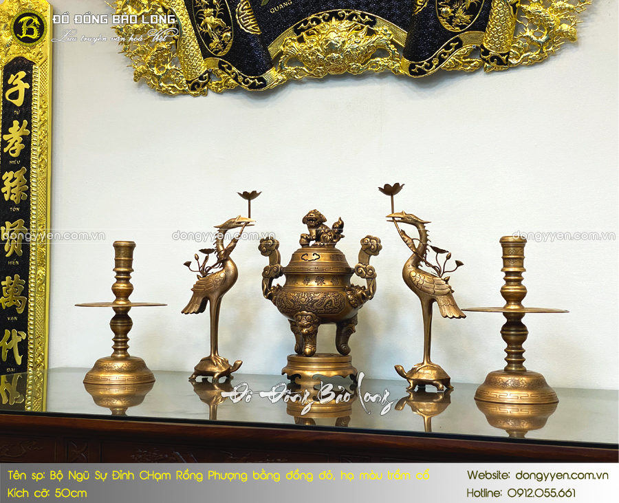 - Số lượng: Một bộ đồ thờ Ngũ sự bao gồm: 1 đỉnh chạm Long Phụng chầu nguyệt, 2 hạc thờ, 2 chân nến,…