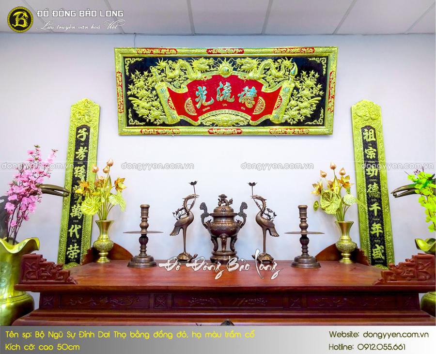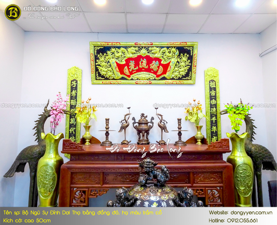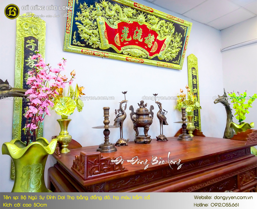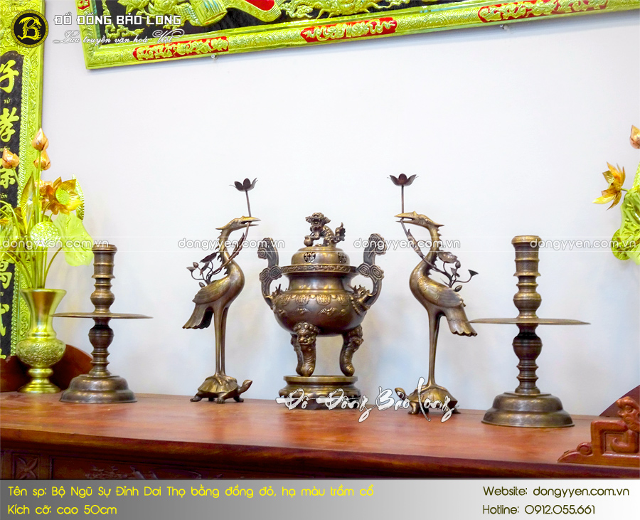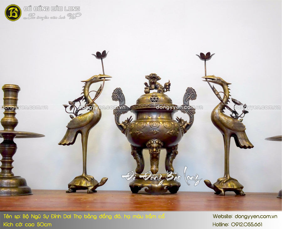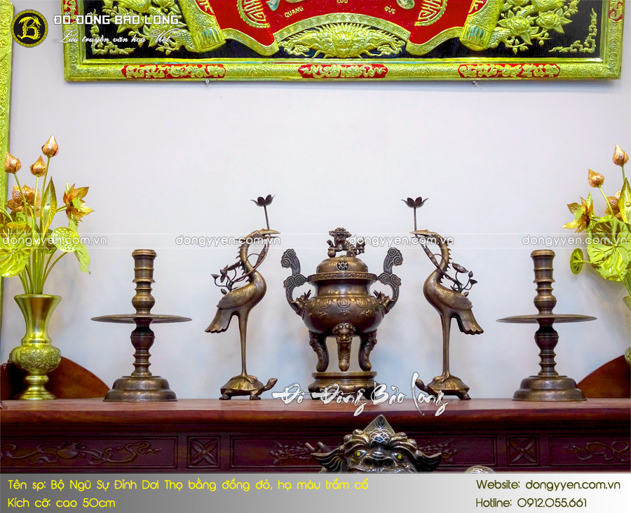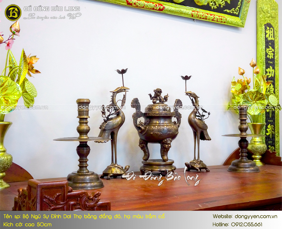 - Số lượng: Một bộ đồ thờ Ngũ sự bao gồm: 1 đỉnh Dơi chữ Thọ, 2 hạc thờ, 2 chân nến,…
