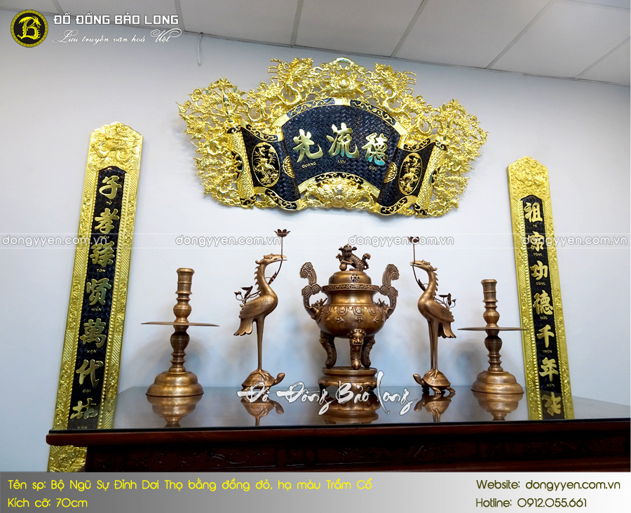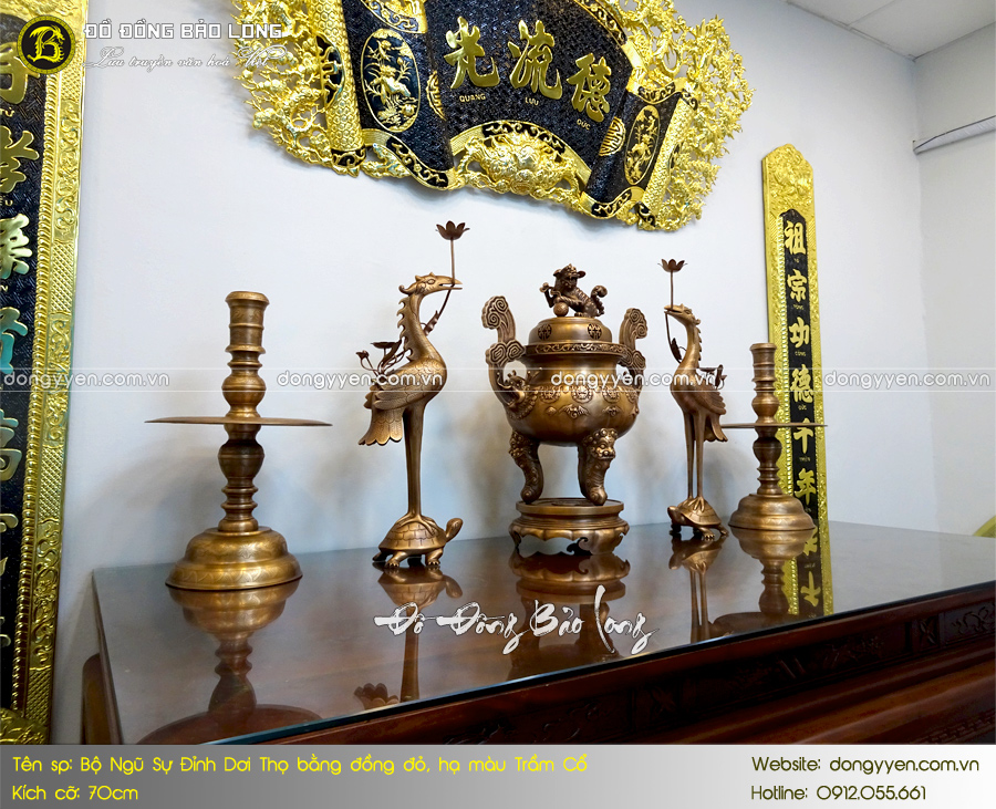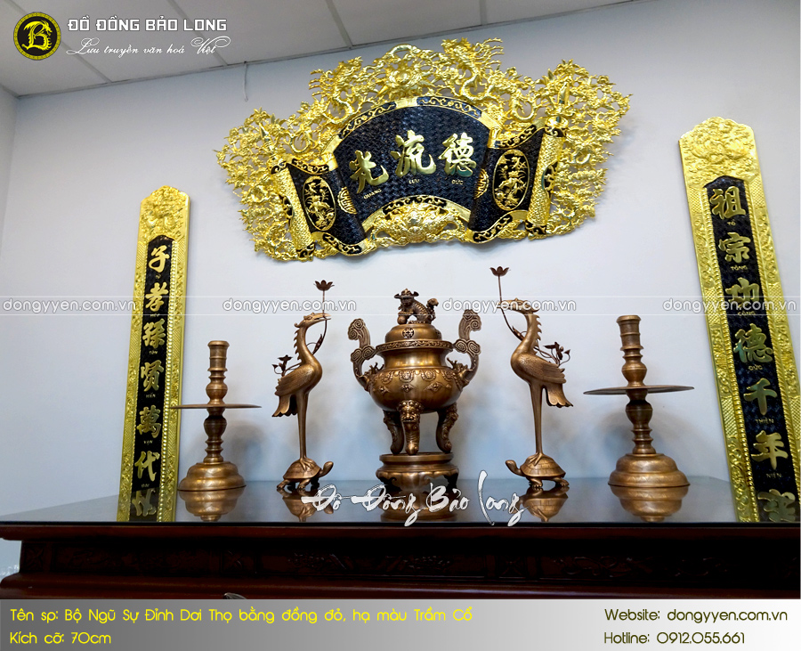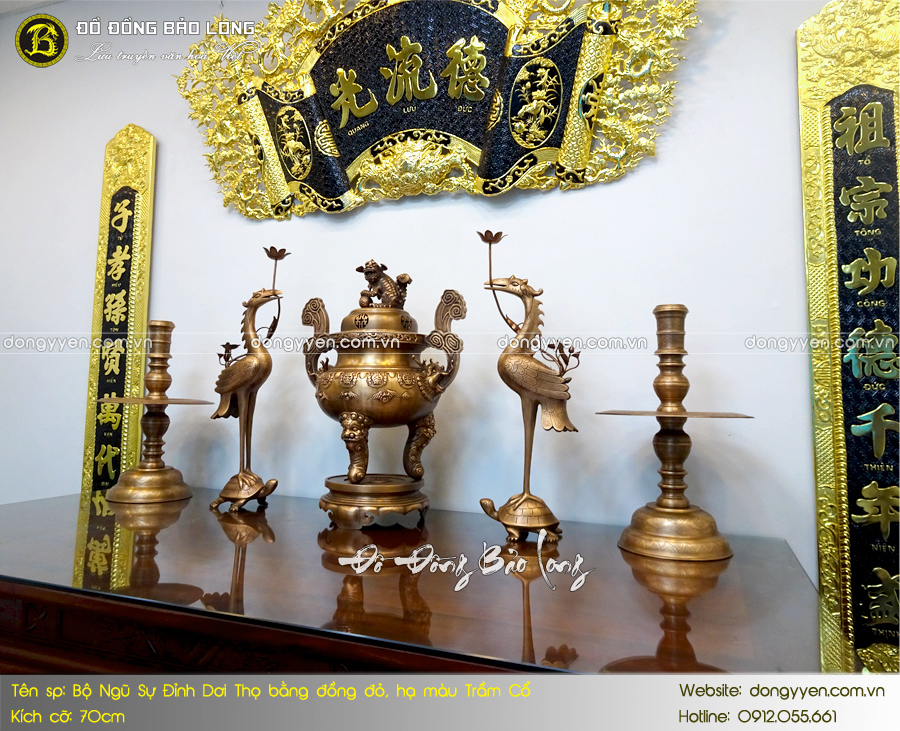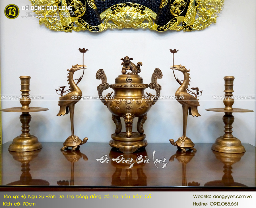 - Số lượng: Một bộ đồ thờ Ngũ sự bao gồm: 1 đỉnh Dơi chữ Thọ, 2 hạc thờ, 2 chân nến,…