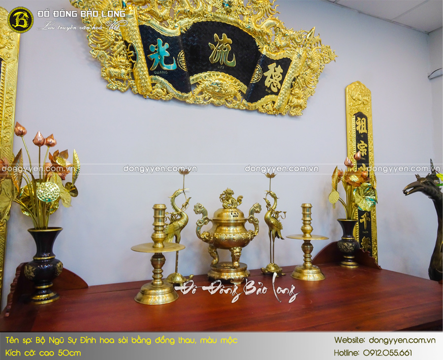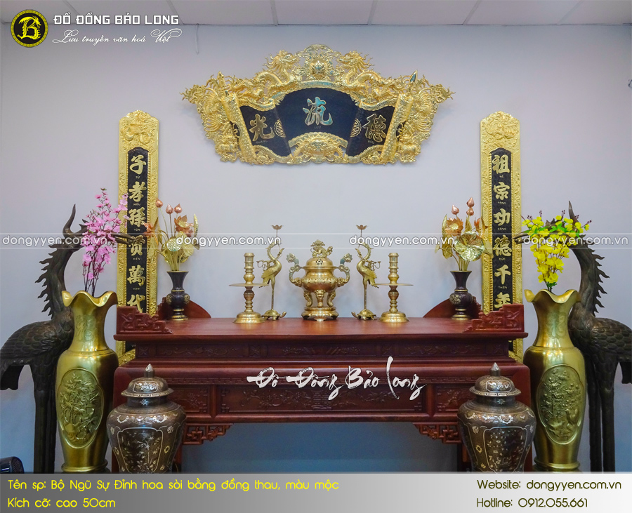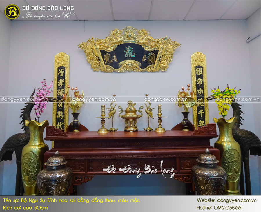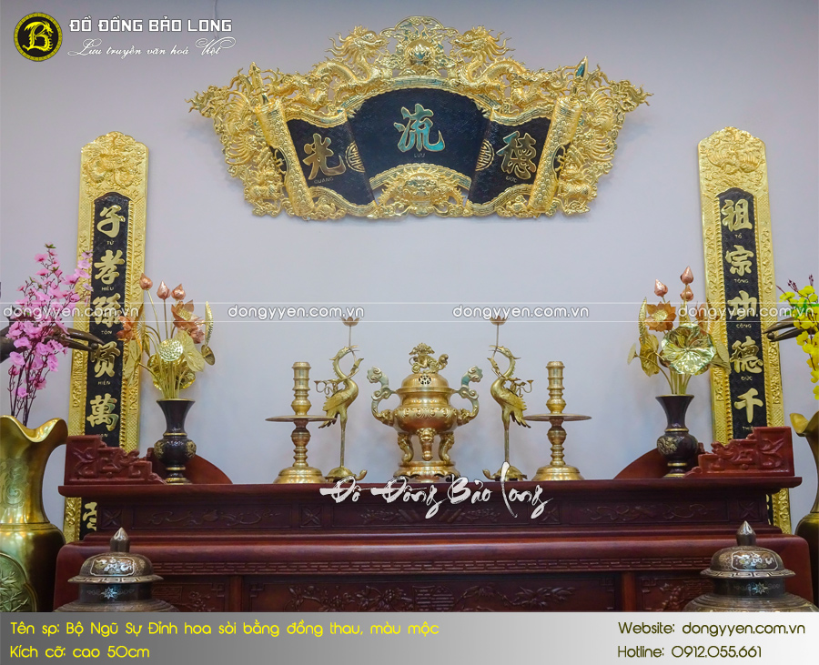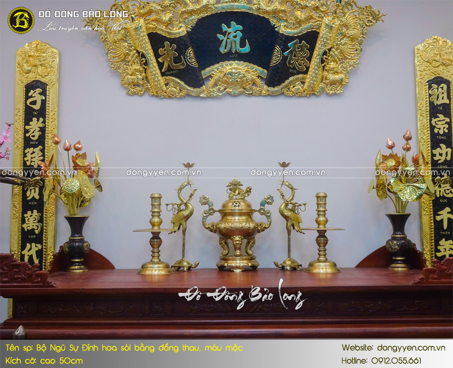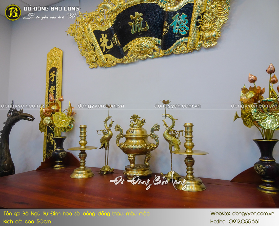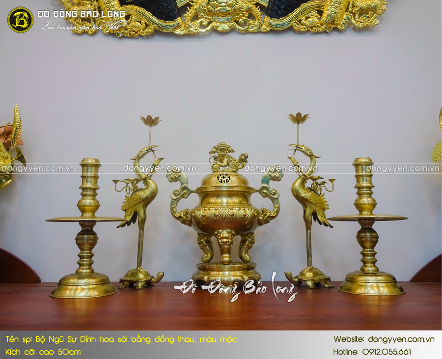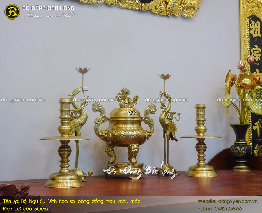 - Số lượng: Một bộ đồ thờ Ngũ sự bao gồm: 1 đỉnh đúc nổi hoa Sòi, 2 hạc thờ, 2 chân nến,…