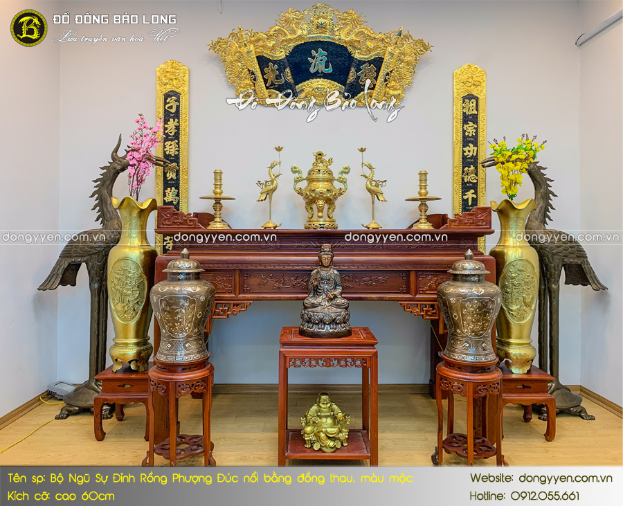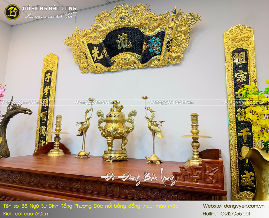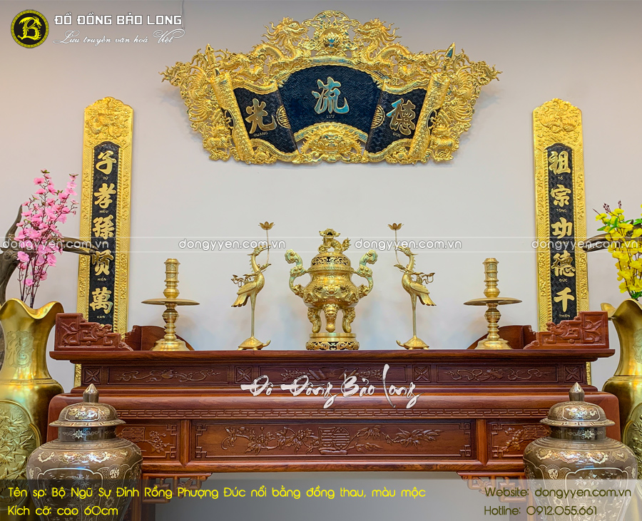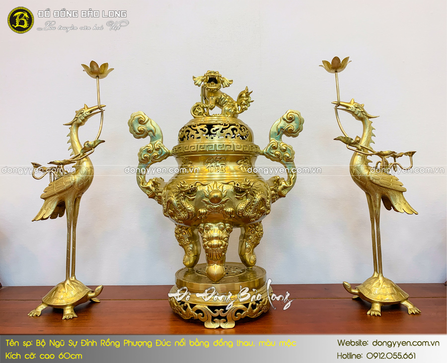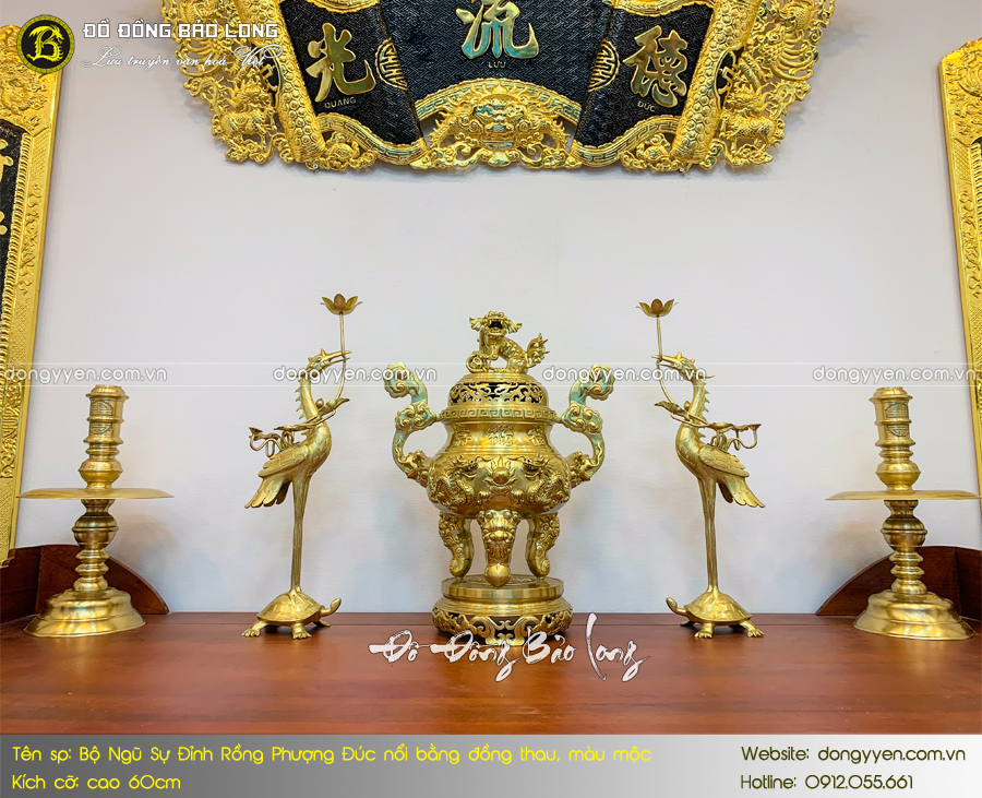 - Số lượng: Một bộ đồ thờ Ngũ sự bao gồm: 1 đỉnh đúc nổi rồng chầu nguyệt, 2 hạc thờ, 2 chân nến,…