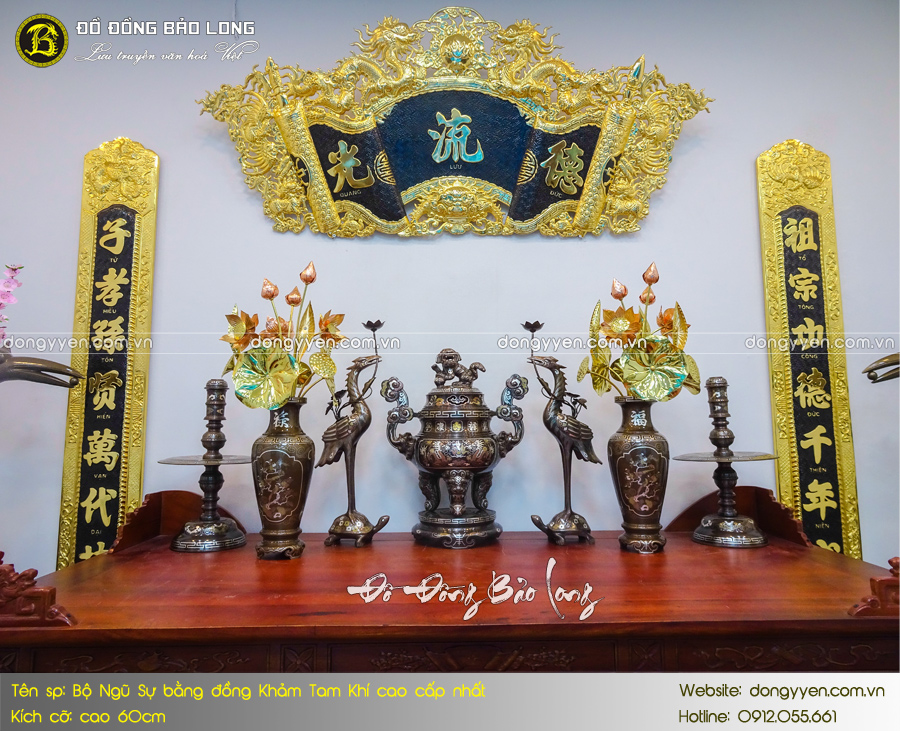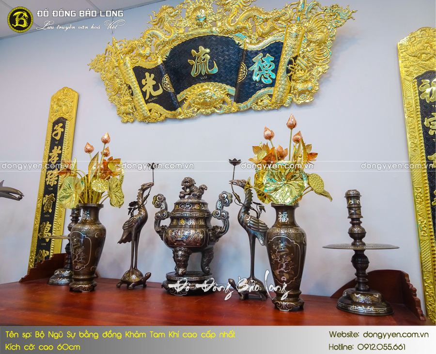 Bộ Ngũ sự khảm Tam khí 1 chữ vàng mẫu mới cao 60cm được chế atsc thủ công. Sản phẩm có kiểu dáng hoa văn mới nhất, tăng tỉ lệ vàng trên bề mặt rất sang trọng.