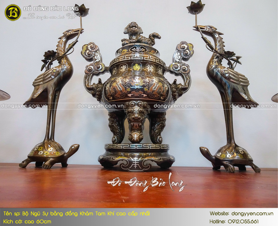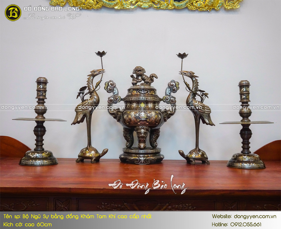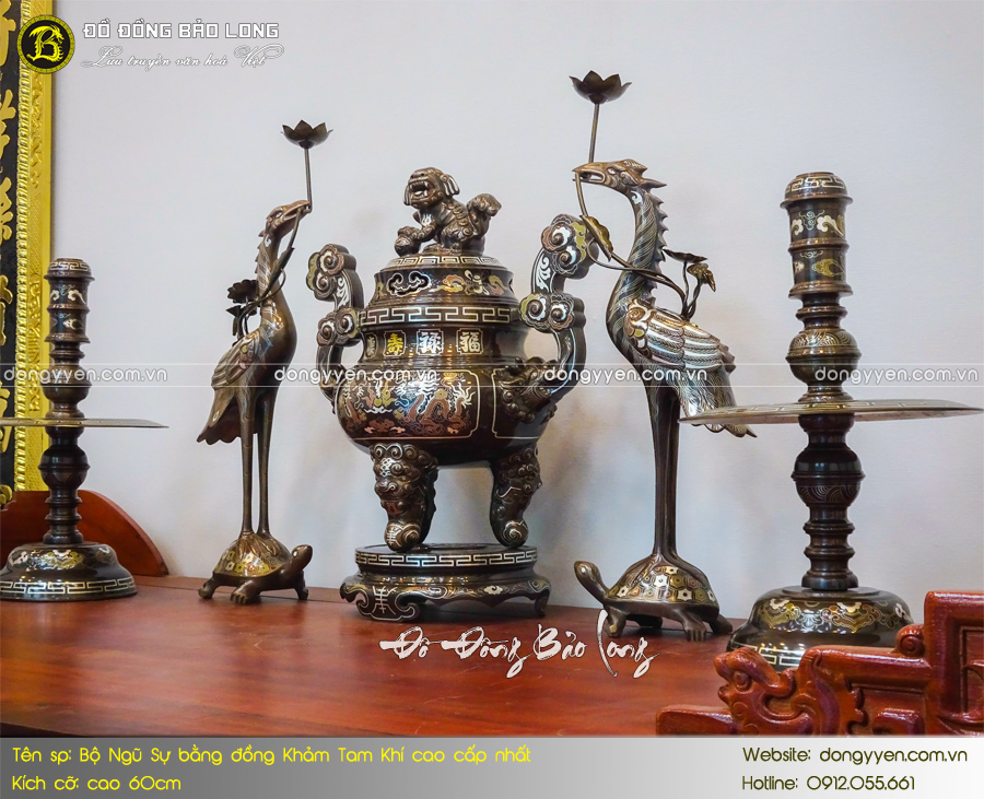 Bộ Ngũ sự khảm Tam khí là sản phẩm thuộc phân khúc cao cấp tại Bảo Long. Sản phẩm có chất lượng hoàn thiện, độ bền và tuổi thọ cao. Sản phẩm hoàn toàn vượt trội với các mẫu thông thường từ kiểu dáng, chi tiết hoa văn, độ hoàn hảo, độ bền chắc. Sản phẩm được đúc thủ công hoàn toàn từ đồng đỏ thanh khiết. Các nghệ nhân đã hoàn thành qua nhiều công đoạn mới cho ra sản phẩm hoàn chỉnh. bề mặt bộ đồ thờ được khảm các đường kim loại vàng, bjac và đồng đỏ tạo hoa văn sắc nét.