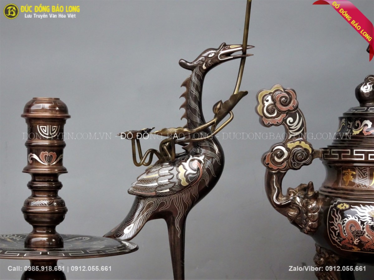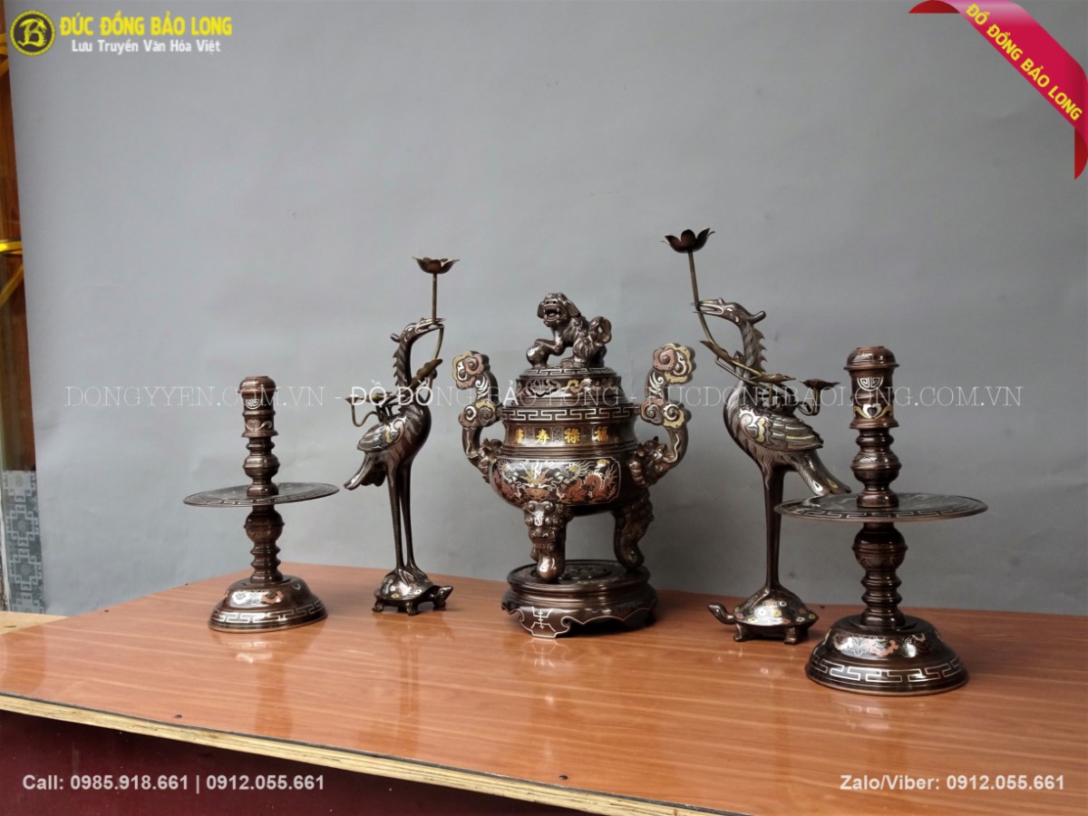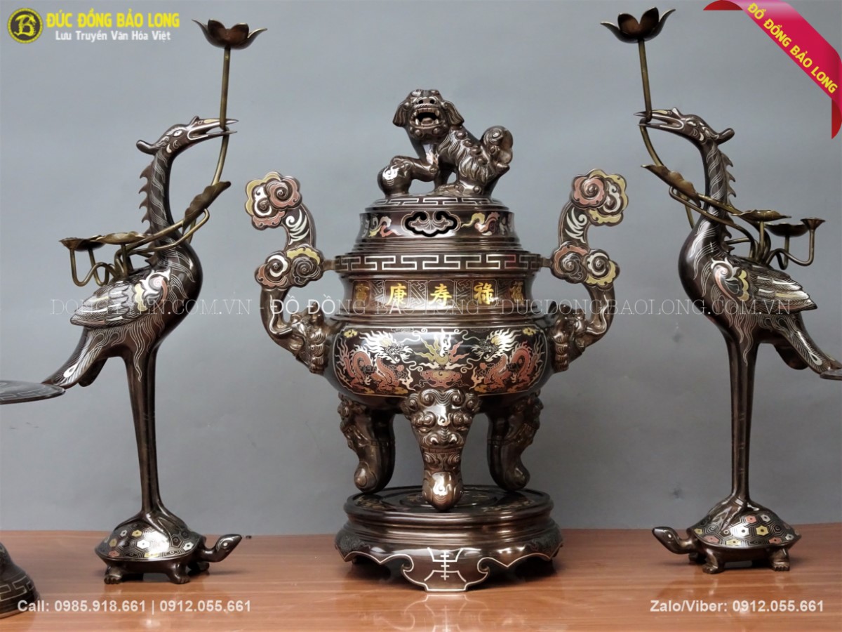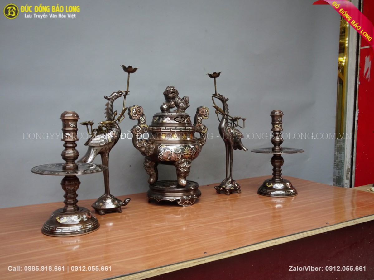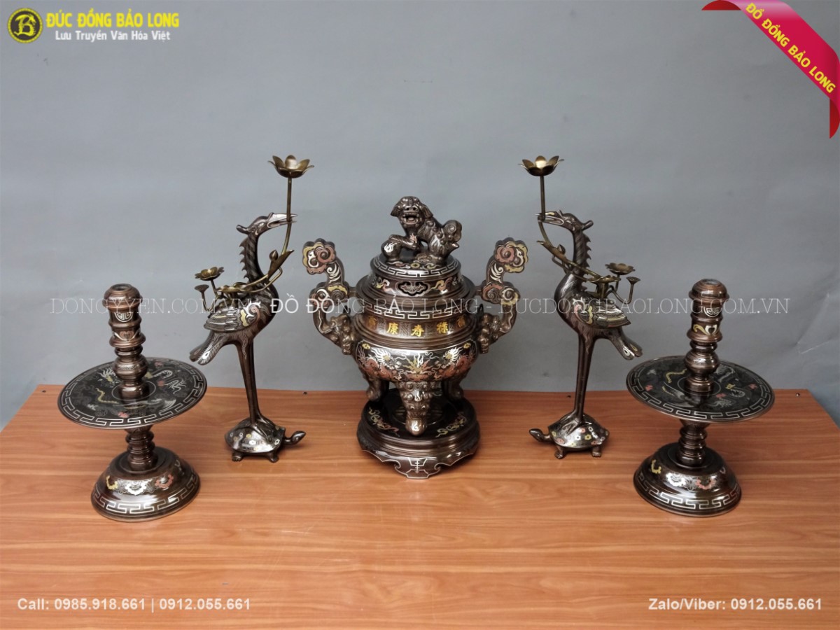 Bộ ngũ sự khảm tam khí 55cm gồm 1 đỉnh đồng khảm 5 chữ vàng, đôi hạc đồng, đôi chân nến. Đây là những dòng sản phẩm thuộc loại cao cấp nhất trên thị trường. Qúy khách tham khảo thêm một số phụ kiện khác đi kèm như: mâm bồng, khay chén, đài thờ, bát hương đồng