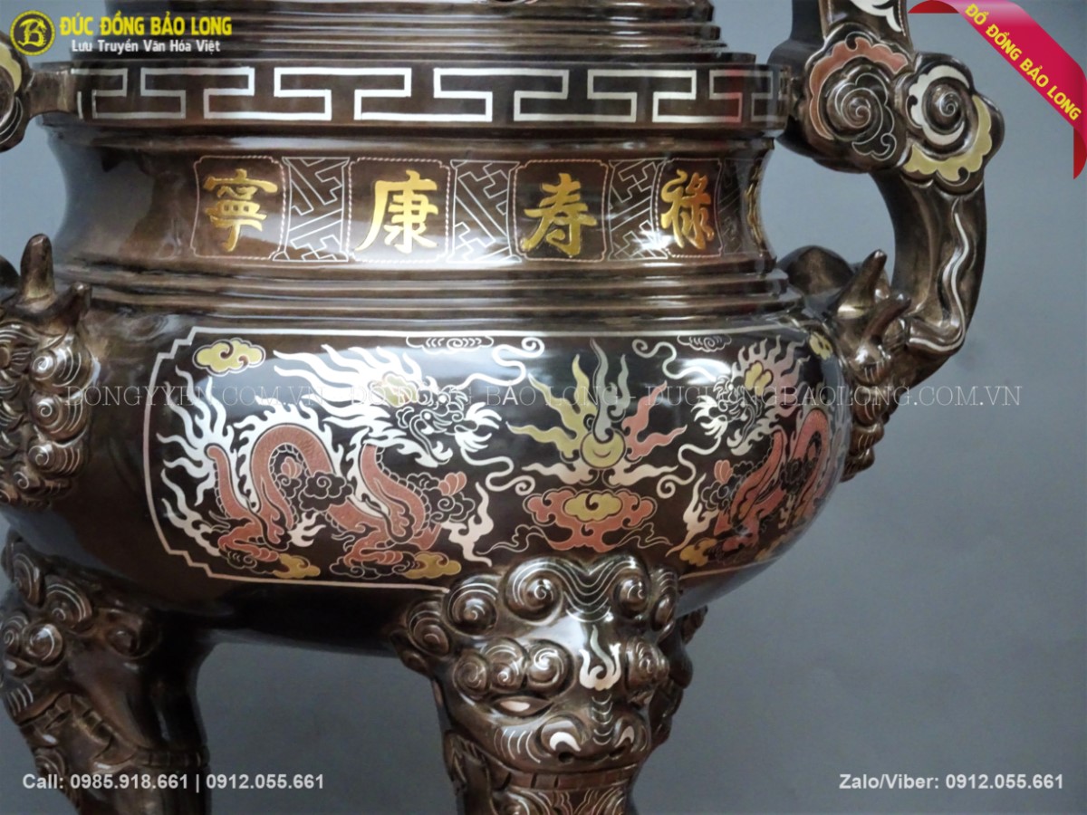 Bộ ngũ sự khảm tam khí được các nghệ nhân đúc hoàn toàn thủ công từ nguyên liệu đồng nồi hè. Sản phẩm được khảm tam khí cao cấp bằng các kim loại quý như vàng 9999, bạc, đồng đỏ, đồng đen. Đỉnh thờ được chạm rồng chầu mặt nguyệt, mặt trước khảm 5 chữ vàng Phúc Lộc Thọ Khang Ninh. Các hoa văn trên bộ đồ thờ được chạm rất tỉ mỉ và sắc nét. Bộ đồ thờ này có kích thước 55cm dành cho bàn thờ từ 1m76 đến 1m97.