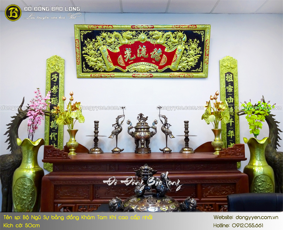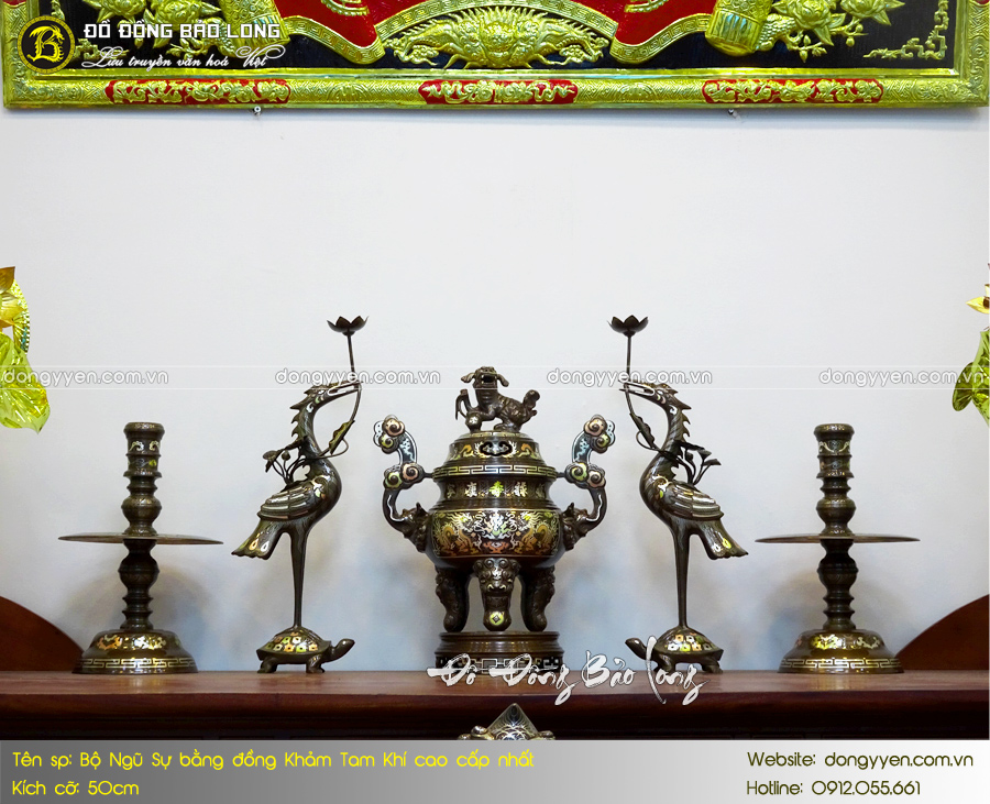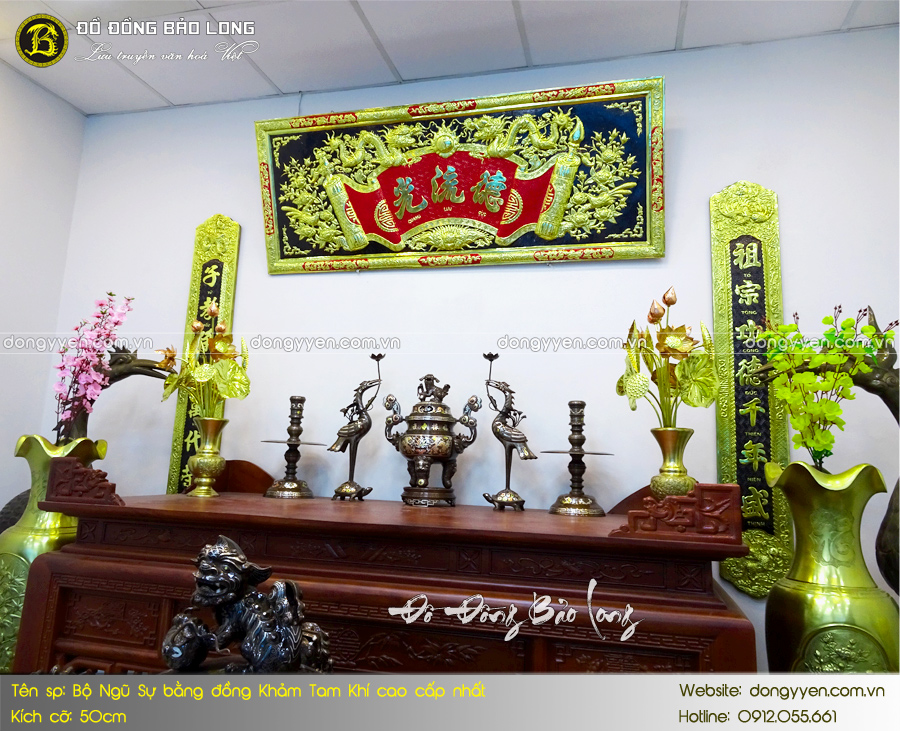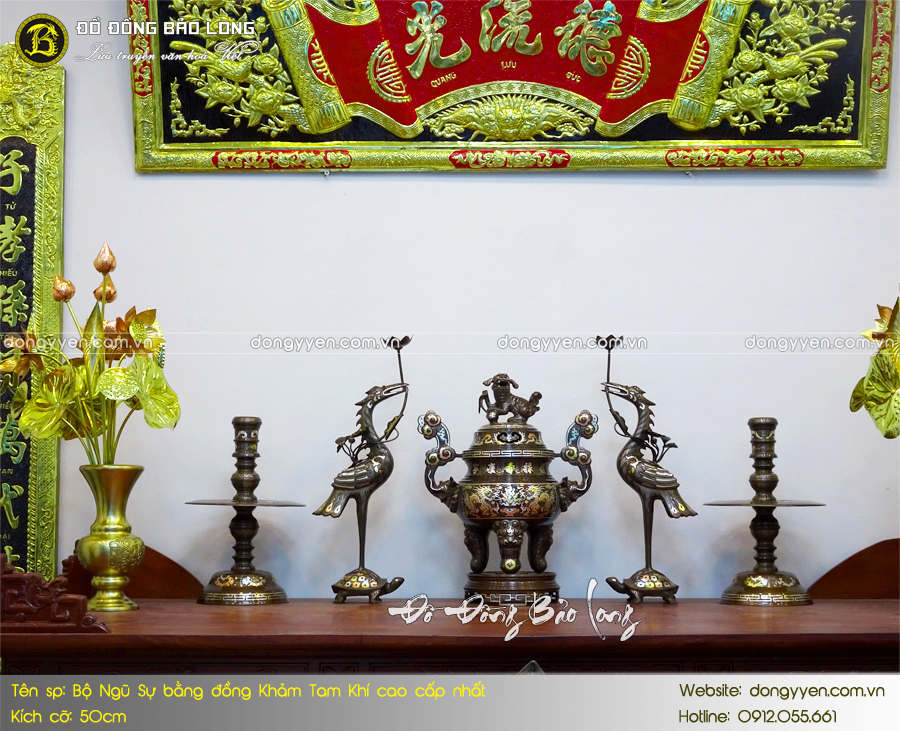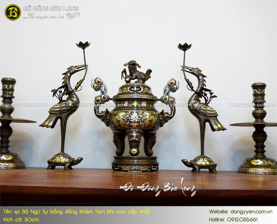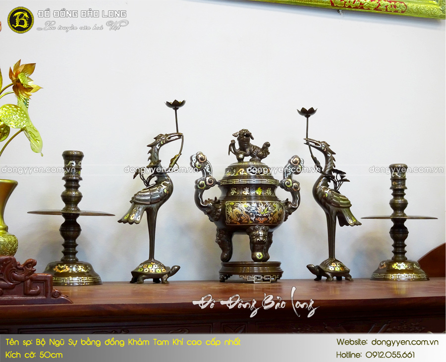 Bộ đồ thờ Ngũ sự khảm Tam khí là sản phẩm thuộc phân khúc cao cấp tại Bảo Long. Sản phẩm có chất lượng hoàn thiện, độ bền và tuổi thọ cao. Sản phẩm hoàn toàn vượt trội với các mẫu thông thường từ kiểu dáng, chi tiết hoa văn, độ hoàn hảo, độ bền chắc.