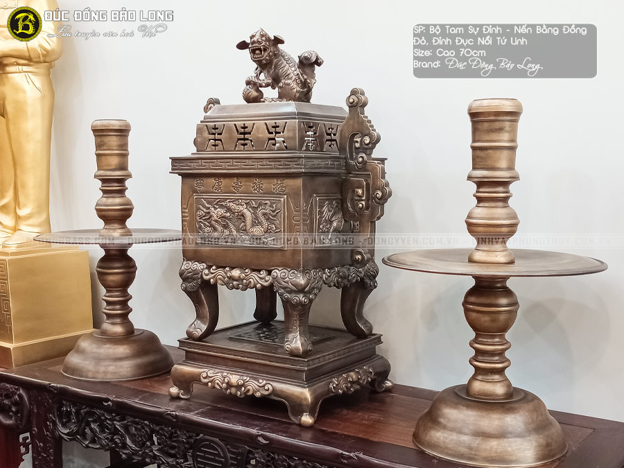 Chất lượng bộ tam sự đỉnh Tứ Linh chân nến đồng đỏ cao 70cm