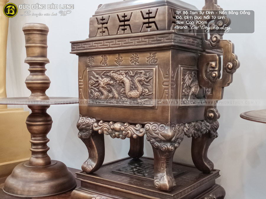 - 01 Đỉnh tứ linh "Long, Lân, Quy, Phụng" và đôi chân nến - Hoa văn đúc nổi đẹp, mẫu đỉnh vuông cổ |
