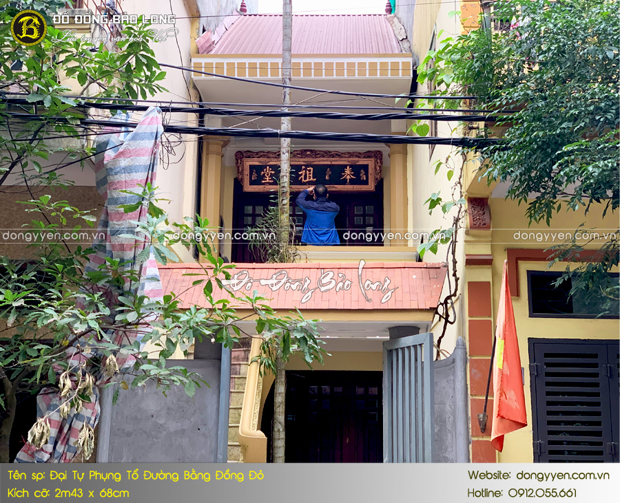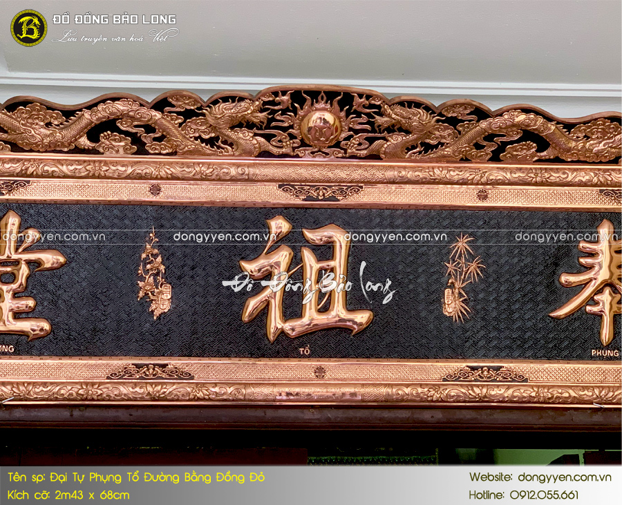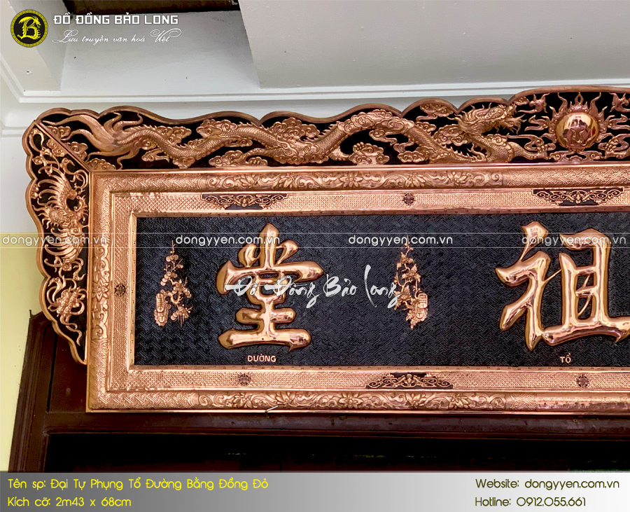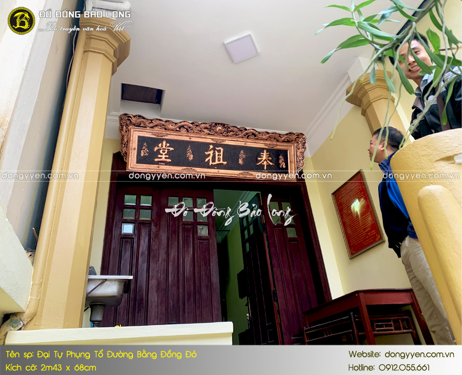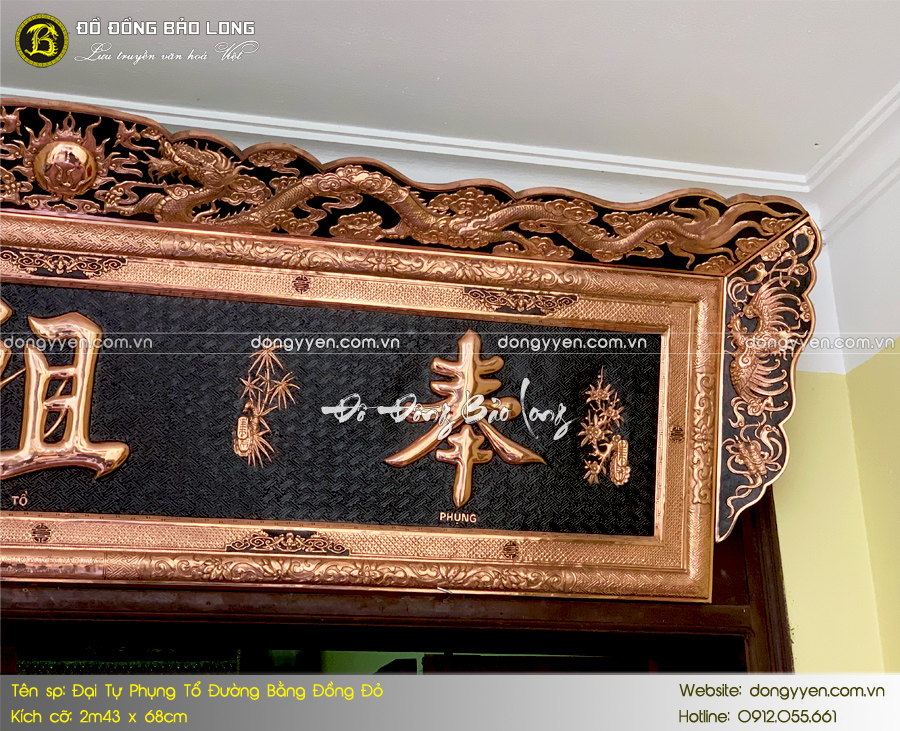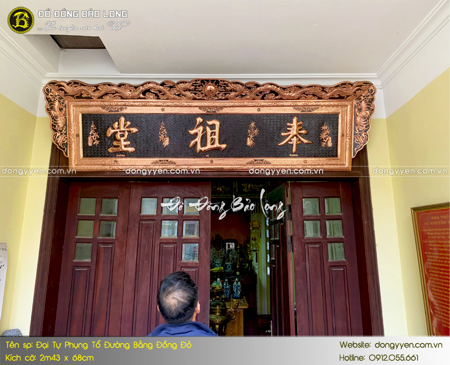 Bức Đại tự Phụng từ đường chữ Hán 2m43 được chế tác thủ công 100%. Sản phẩm được chạm tay thủ công từ chất liệu đồng thanh khiết, kiểu dáng độc đáo. Toàn bộ bề mặt sản phẩm được chạm tỉ tỉ các hoa văn, mẫu chữ. Bảo Long vừa lắp đặt cho nhà thờ tổ của khách hàng Hòa Bình.