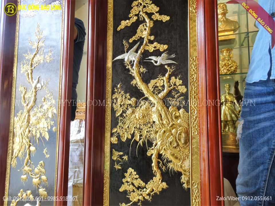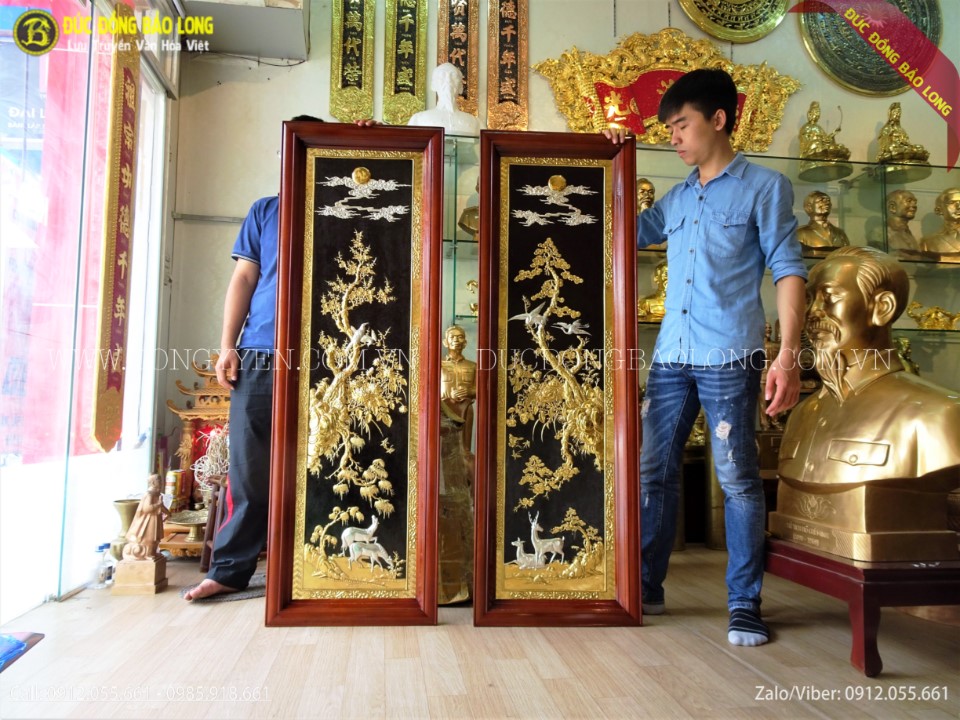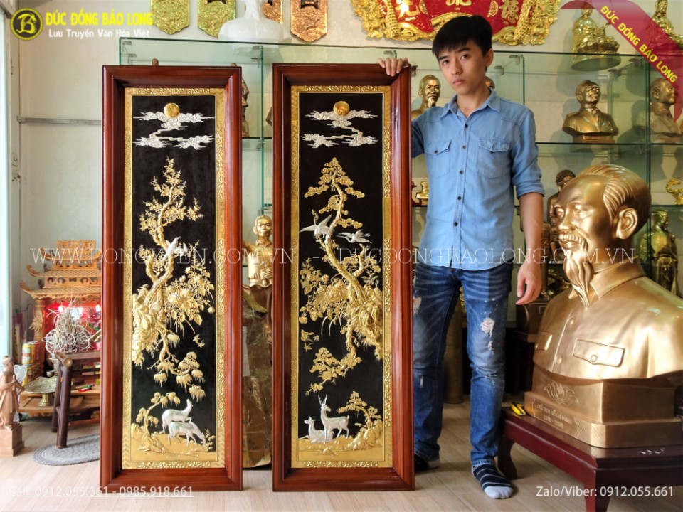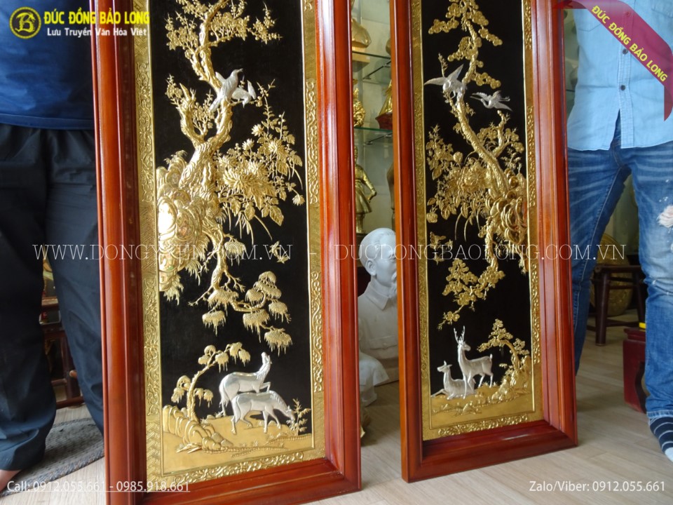 Đôi tranh tứ thời Tùng Lộc - Mai Điểu thuộc hàng cao cấp, độc đáo rất hiếm trên thị trường. Tranh được chạm tay hoàn toàn thủ công từ đồng vàng nhập khẩu Hàn Quốc, đồng dày 8rem, khung gỗ đinh hương cao cấp. Toàn bộ tranh được mạ phủ vàng ròng 24k, mạ điểm bạc các con chim, hươu, nai và mây. Đây là cặp tranh khổ đứng đẹp nhất phù hợp với những khoảng treo tường hẹp ngang như cầu thang hoặc 2 bên ti vi, 2 bên tủ hoặc thư phòng.