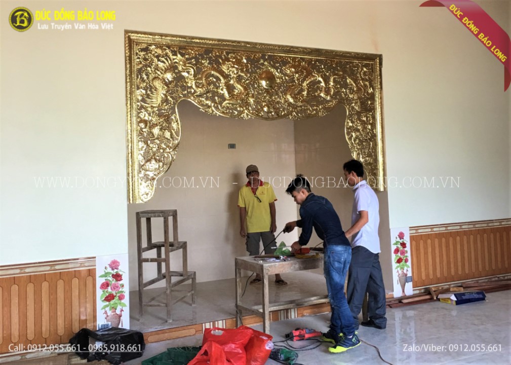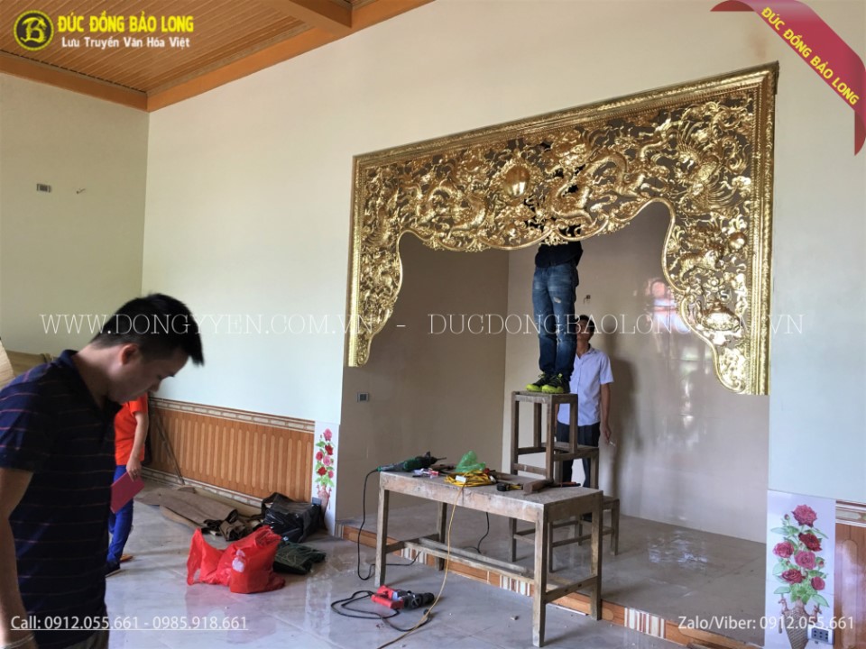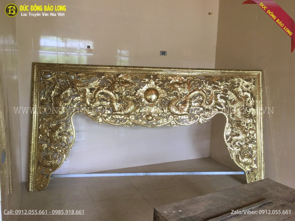 Cửa võng bằng đồng treo nhà thờ 3m21 được làm theo yêu cầu của vị khách hàng tại Thanh Hóa cho việc treo tại nhà thờ tổ. Mặt trước cửa võng được chạm lưỡng long chầu nguyệt, 2 bên chạm tứ linh Long Ly Quy Phụng, các hoa văn chạm rất tỉ mỉ, sắc nét. Mọi quy trình sản xuất được các nghệ nhân chạm hoàn toàn thủ công bằng tay từ nguyên liệu đồng vàng nhập khẩu Hàn Quốc, đồng dày 8rem, khung xương inox rất chắc chắn giúp sản phẩm không bị cong vênh và giữ gắn cố định cửa võng lên tường.