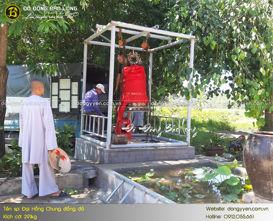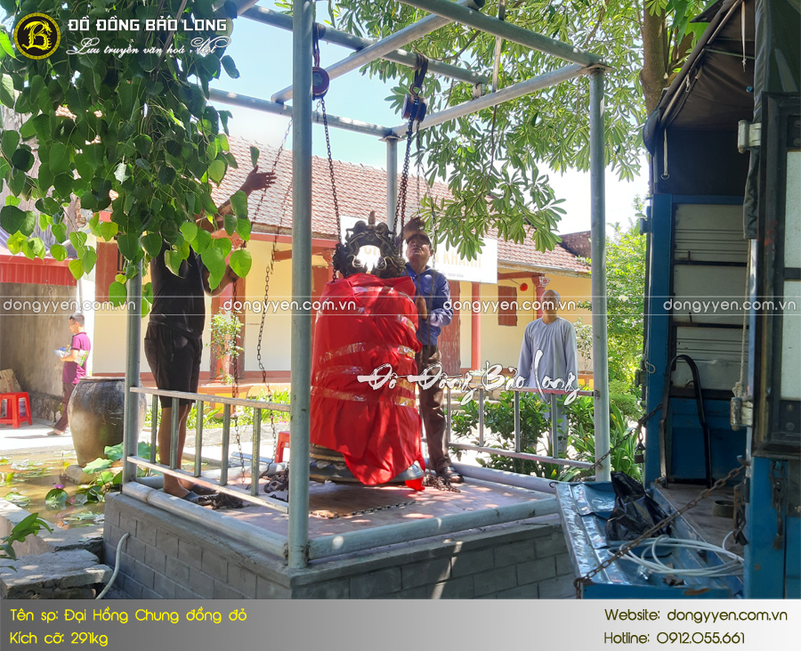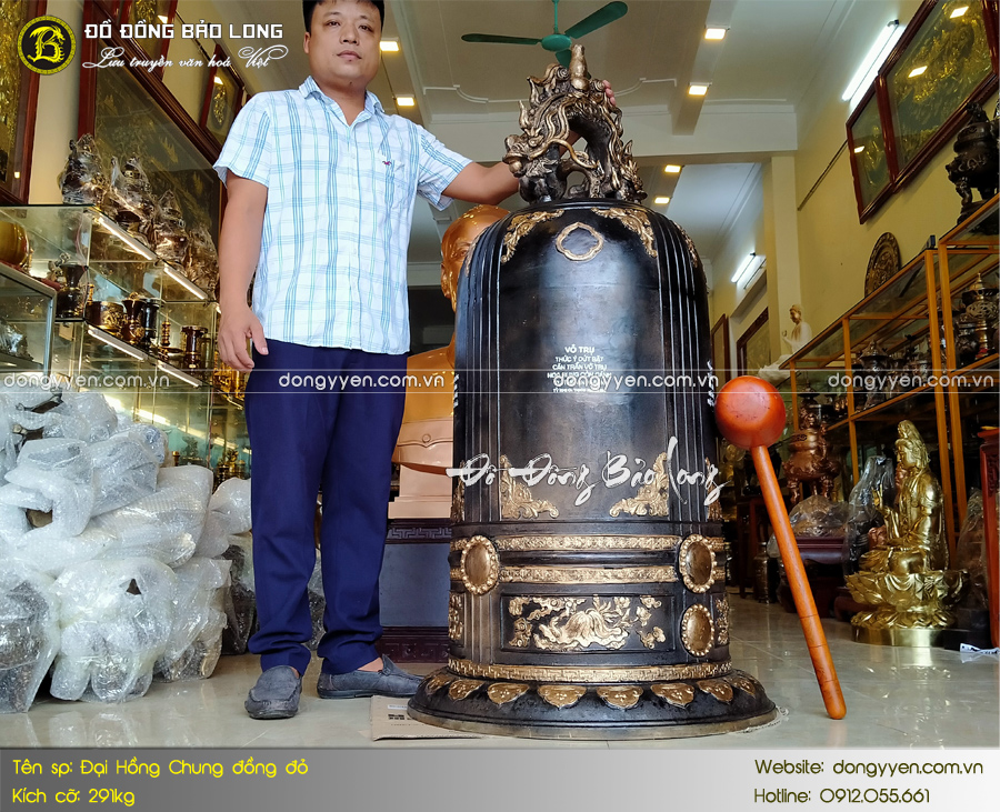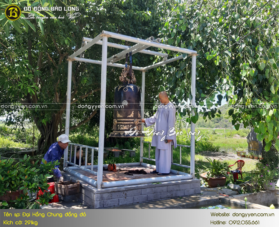 Đại hồng chung 291kg cho chùa ở Ninh Bình là sản phẩm Chuông đồng cỡ lớn mới nhất tại Bảo Long. Chiếc Chuông đồng được chế tác bởi các nghệ nhân đúc đồng lâu năm. Kiểu dáng được phỏng theo chiếc chuông cổ lâu năm, mang ý nghĩa quan trọng trong Phật Giáo.