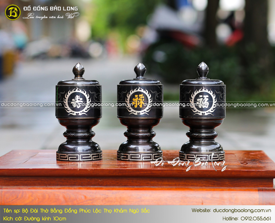 - Đài thờ bằng đồng khảm tam khí: kích thước 8cm, 10cm, 12cm có giá từ 3.800.000 đến 7.400.000đ/bộ
