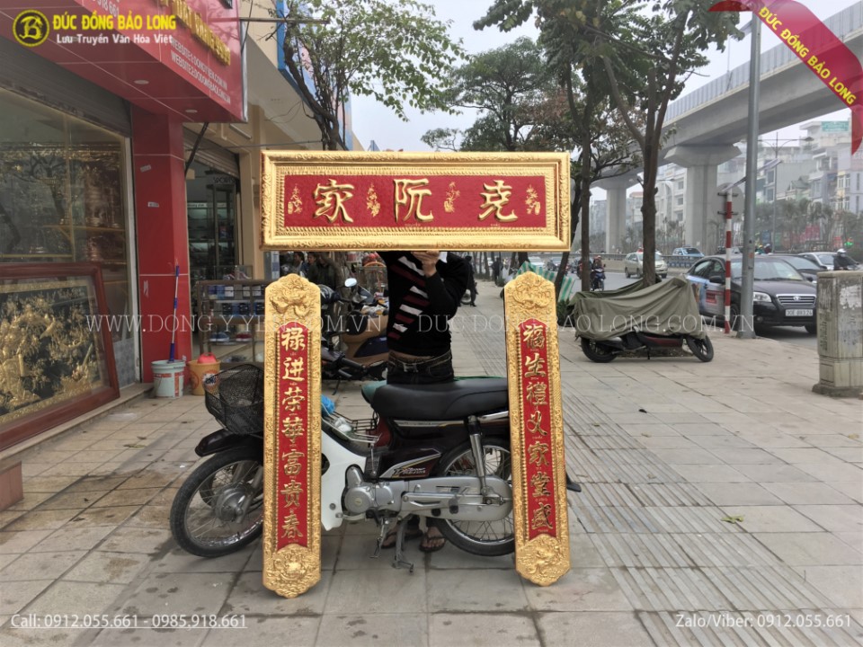 Bộ Đại Tự Câu Đối Bằng Đồng Mạ Vàng 24k cho khách ở Sài Gòn có kích thước 1m27, đây chỉ là một trong những kích thước phổ thông của cơ sở Bảo Long. Chúng tôi còn chế tác với kích thước khác như: 1m35, 1m55, 1m76, 1m97, ngoài ra quý khách có thể đặt kích thước theo yêu cầu của mình. Các con số kích thước ở trên là những con số rất đẹp trong phong thủy và đã được lấy chuẩn bằng thước loban.