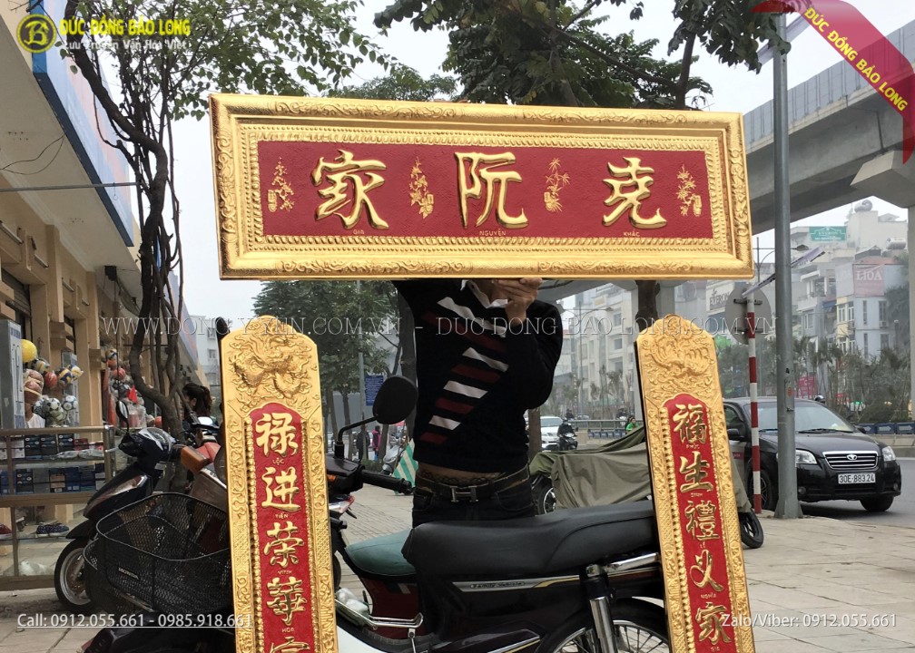 Cơ sở Đúc Đồng Bảo Long vừa hoàn thiện xong đơn hàng gồm bộ sản phẩm đại tự câu đối bằng đồng mạ vàng cho khách Sài Gòn. Bộ đại tự câu đối này được Bảo Long chế tác rất tâm huyết theo sự yêu cầu của khách hàng, toàn bộ chữ trên đại tự và câu đối đều được khách hàng tự tham khảo và cung cấp cho Bảo Long. Trên bức đại tự khắc 3 chữ "Gia - Nguyễn - Khắc" và 2 câu đối có câu là: "Phúc sinh lễ nghĩa gia đường thịnh/ Lộc tiến vinh hoa phú quý xuân"