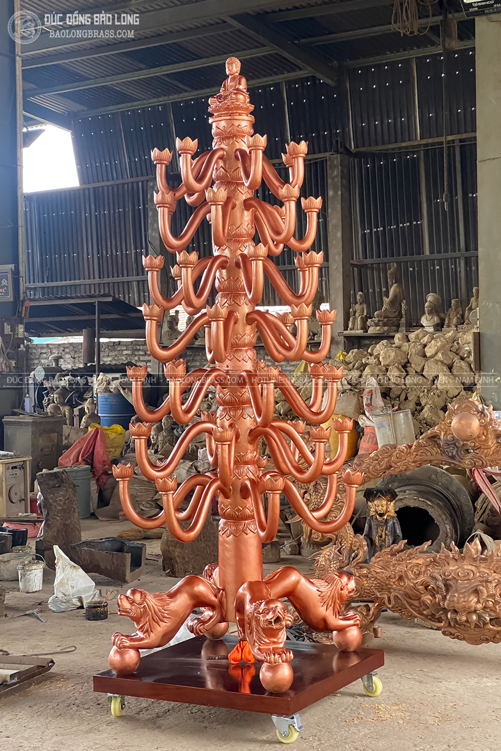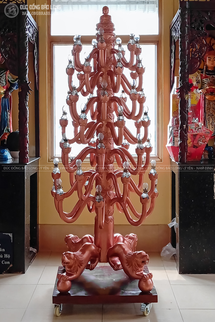 Mỗi ngọn đèn thường được tạo hình hoa sen hoặc uốn lượn mềm mại, bên trong khoét rỗng để đặt bóng đèn điện hoặc chân nến/đèn dầu. Thiết kế đặc biệt vững chắc, thường có 4 chân khắc họa hình ảnh Nghê vờn cầu (hoặc chạm khắc 3 con Lân chụm lại, tạo thế kiềng 3 chân vững chãi).