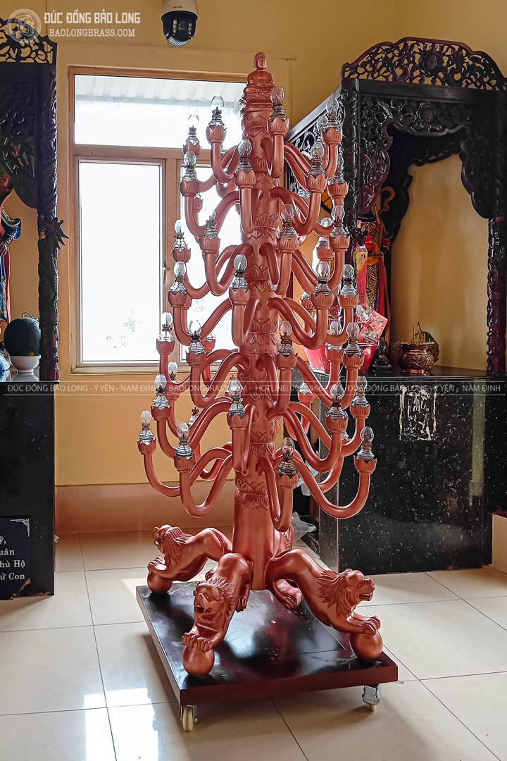 Đèn Dược Sư đúc thủ công bằng đồng đỏ cao 2m3 là một vật phẩm thờ cúng cao cấp và quy mô lớn, thường được bài trí trong các không gian thờ tự trang nghiêm như chùa, điện thờ, hoặc phòng thờ Phật lớn.
