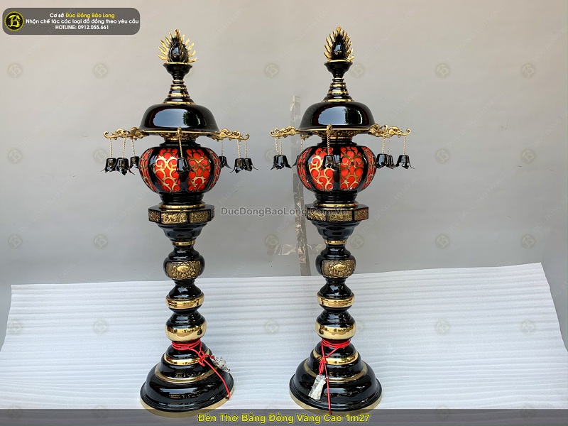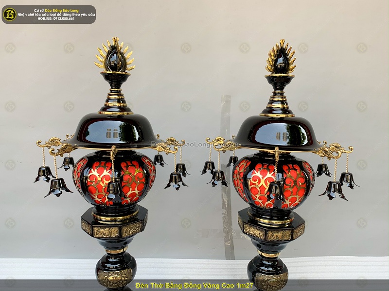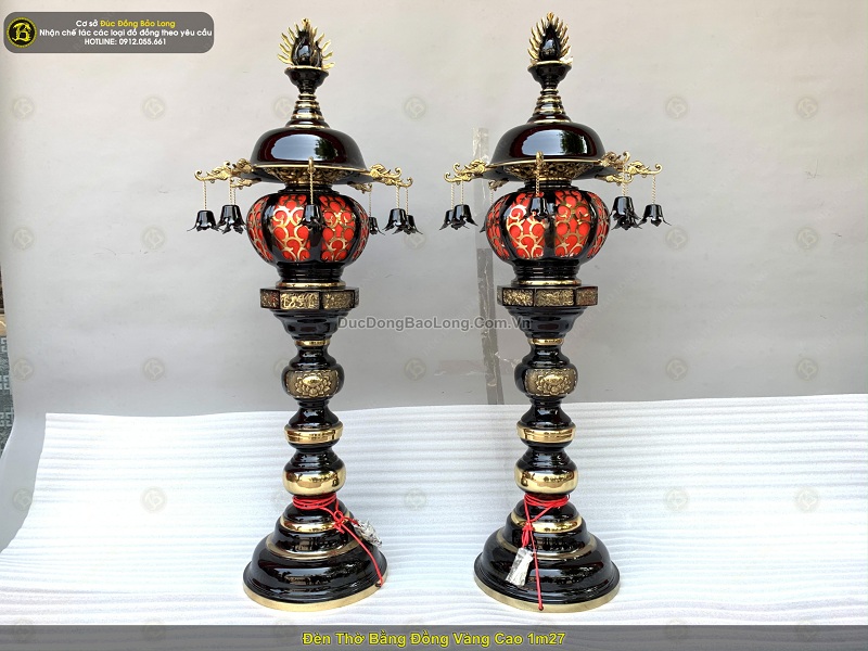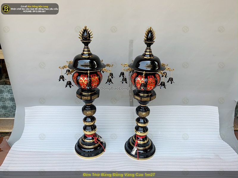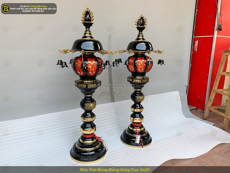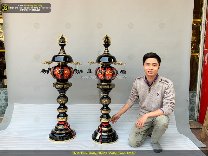 Cơ sở Đúc Đồng Bảo Long vừa thực hiện chế tác và đúc hoàn thiện đôi đèn thờ bằng đồng vàng cao 1m27. Đây là cặp đèn thờ cỡ lớn thường được dùng trong các chùa, đình, đền, miếu, nhà thờ,...
