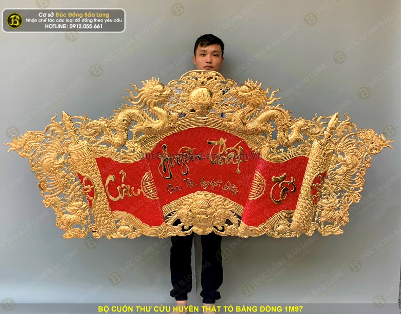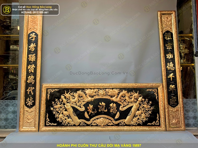 Các mẫu hoành phi, cuốn thư, cửu huyền thất tổ tại Đúc Đồng Bảo Long được chế tác thủ công mỹ nghệ tinh xảo với họa tiết hoa văn sắc nét. Cam kết sử dụng nguyên liệu đồng 8 rem nhập khẩu, dày dặn cho độ bền lâu. Bảo hành vĩnh viễn đối với các sản phẩm mạ vàng 24k, dát vàng 9999. Ngoài ra Bảo Long còn nhận đặt làm theo yêu cầu của khách hàng, giá cả vô cùng phải chăng. Tin chắc có thể làm hài lòng ngay cả những khách hàng khó tính nhất.