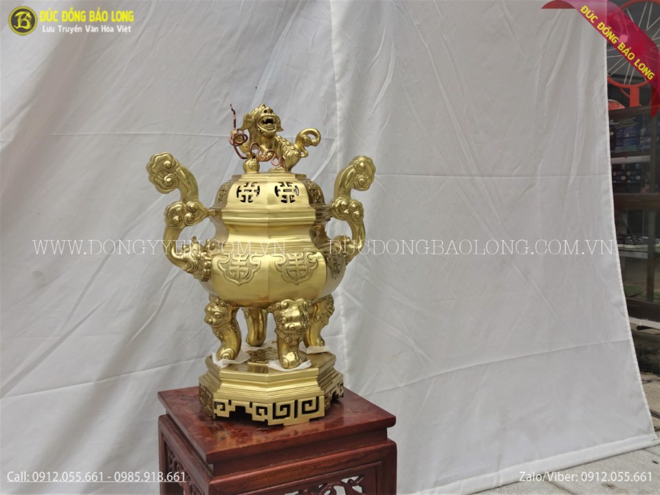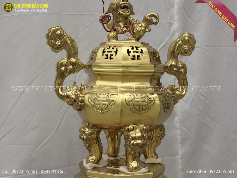 Đỉnh bát giác bằng đồng có chiều cao 50cm phù hợp với bàn thờ 1m55 hoặc 1m76. Ngoài sử dụng đỉnh thờ quý khách có thể tham khảo thêm các bộ đồ thờ bằng đồng đầy đủ có các phụ kiện đi kèm với đỉnh.