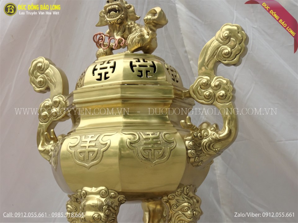 Đỉnh đồng bát giác bằng đồng catut 70cm có 8 cạnh 8 mặt như nhau, gồm 6 chữ thọ. Về bố cục giống với các mẫu Đỉnh Đồng Thờ Cúng khác đều có nắp đỉnh, thân đỉnh tai mây và đế đỉnh.