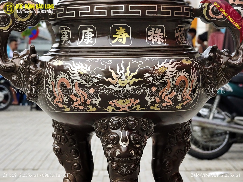 Đỉnh đồng được đúc thủ công bằng tay từ nguyên liệu đồng nồi hè và được các nghệ nhân khảm ngũ sắc (vàng 9999, bạc, đồng). Thân đỉnh được chạm rồng chầu mặt nguyệt. Mặt trước đỉnh chạm 5 chữ Phúc Lộc Thọ Khang Ninh khảm 1 chữ vàng 9999, mặt sau khảm 3 chữ Đức Lưu Quang. Đây là loại đỉnh thuộc loại sản phẩm cao cấp nhất của cơ sở Bảo Long. Sản phẩm rất đẹp, đường nét rất tinh xảo, chất liệu chuẩn đã tạo nên giá trị sản phẩm rất cao. Để cho ra sản phẩm này, Bảo Long đã kết hợp với một số nghệ nhân đúc và khảm độc quyền, các đường nét, hoa văn, sắc sảo hơn rất nhiều so với cơ sở khác.